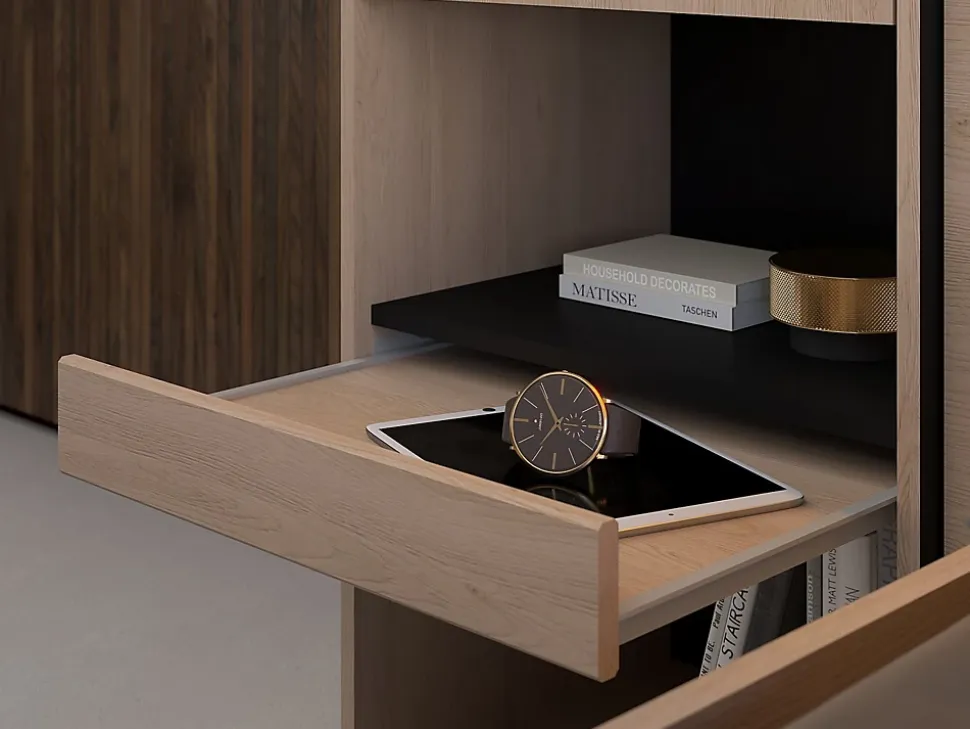 - LEDs intégrées, Branchement USB-C intégré, Chevet intégré, Penderie intégrée, Création exclusive