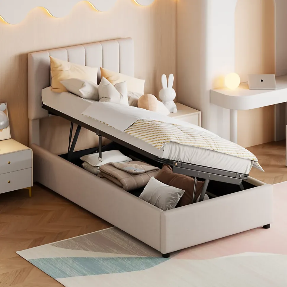 style classique : ce lit pour enfant dispose d’un design classique à rayures verticales sur la tête de lit, ce qui le rend parfait pour les chambres modernes et traditionnelles. La hauteur de la tête du lit est réglable pour accueillir des matelas de différentes hauteurs. lit avec espace de rangement hydraulique : ce lit capitonné dispose d’un espace de rangement hydraulique et le tiroir de lit haut vous offre beaucoup d’espace de rangement, ce qui vous permet d’organiser votre chambre rapidement et facilement. tissu en lin : ce lit rembourré est fabriqué en lin doux pour la peau, résistant à l’usure et ne bouloche pas. Disponible en trois couleurs. Que ce soit pour un lit de garçon ou de fille, vous trouverez toujours une combinaison de couleurs assortie. robuste : fabriqué en bois et structure rembourrée avec sommier à lattes, pas besoin de matelas à ressorts, charge maximale de 150 kg. Ce lit est durable et résiste à toute usure. facile à assembler : les dimensions du produit sont de 203 x 90 x 93/99/105. Tout ce dont vous avez besoin est emballé de manière professionnelle dans des cartons et livré directement à votre porte. Ce cadre de lit est expédié en deux paquets depuis l’allemagne. Parfois, deux cartons n’arrivent pas le même jour. Veuillez attendre 2 à 3 jours ou contacter l’un de nos sympathiques représentants du service client pour plus d’aide.description du produitdimensions totales du produit: 203 x 90 x 93 (99/105) cmpoids total du produit : 34 kgcharge maximale : 150 kg.épaisseur de matelas recommandée : 15-27 cm.type de produit : lit rembourrédimensions : 90 x 200 cmcouleur : beigematériau du produit : mdf + métal + tissu en lin