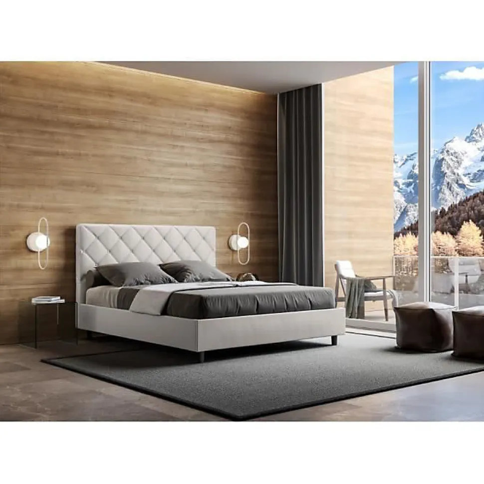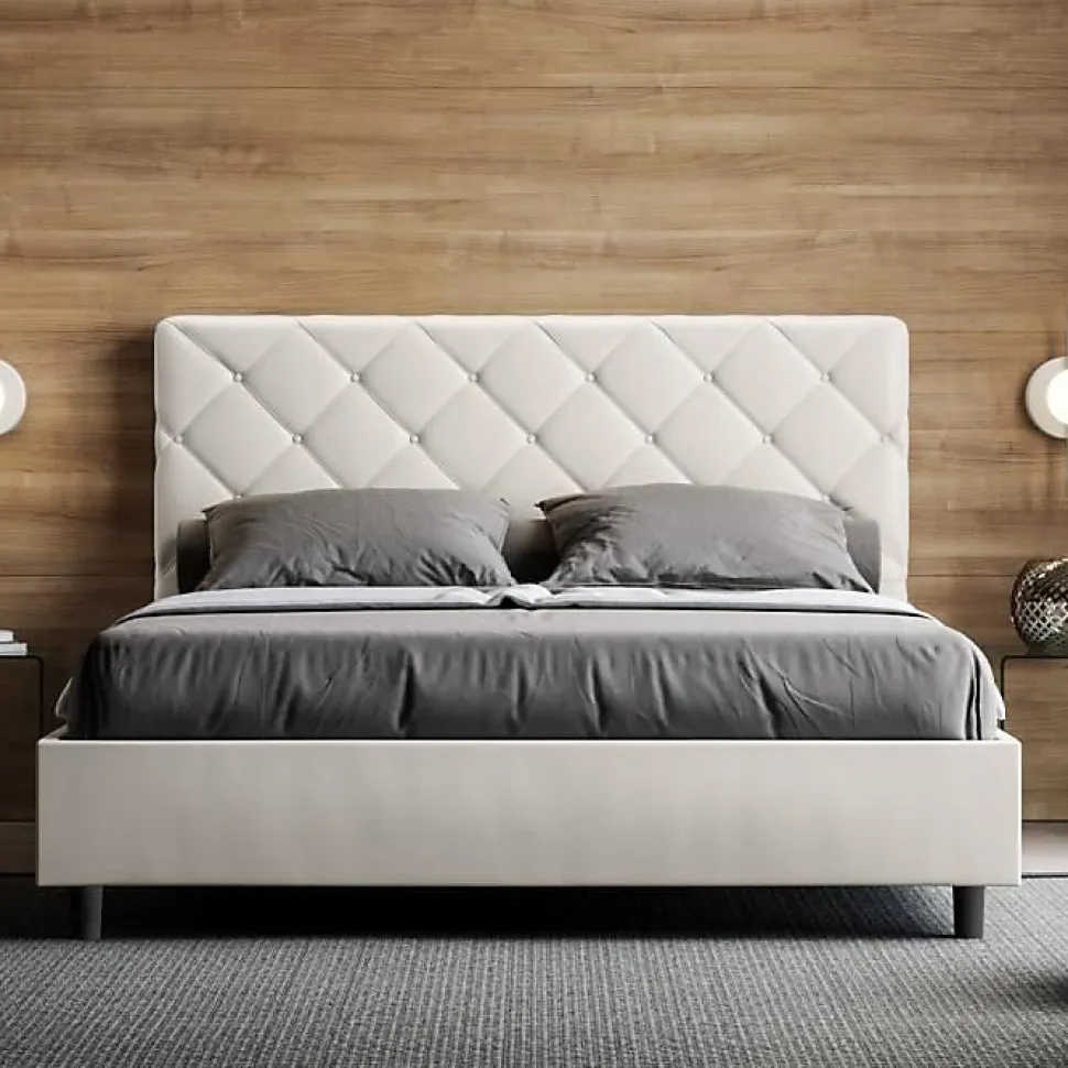 Lit double Priya 160×210 avec tête de lit et lit rembourrés, revêtement en simili cuir, particulièrement polyvalent et facilement combinable avec n’importe quel style d’ameublement.Le lit double Priya 160×210 se caractérise par un style moderne et élégant, mis en valeur par la tête de lit matelassée recouverte de simili cuir.La présence du matériau en simili cuir, en plus de donner à la pièce une atmosphère accueillante et invitante, offre la commodité d’un nettoyage rapide et facile, grâce à l’utilisation d’un simple chiffon en microfibre.Lit fourni avec sommier à lattes, prévu pour un matelas 160×210 cm – Matelas non inclusCouvre-lit non amovible.Produit ItyhomeFabriqué en ItalieDimensions lit : L.175 P.230 H.122 cmHauteur des pieds : 12 cmHauteur du lit : 27 cmHauteur du filet depuis le sol : 39 cm