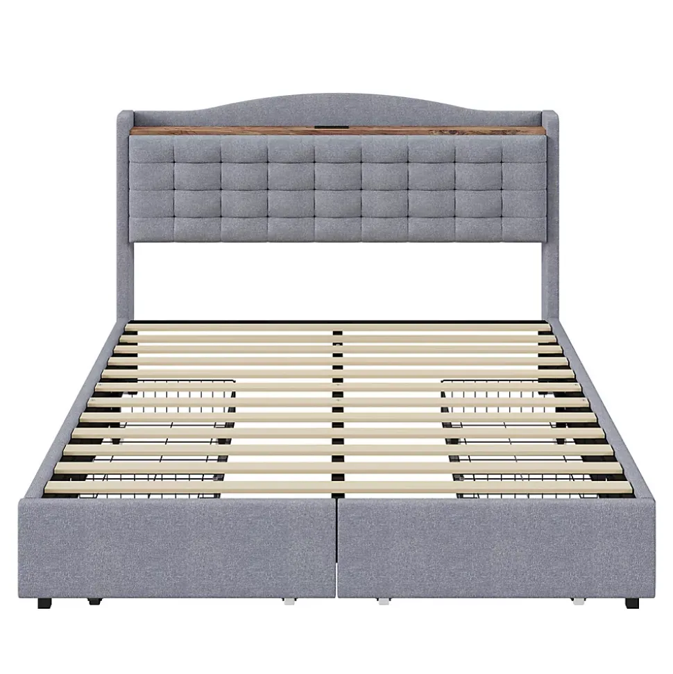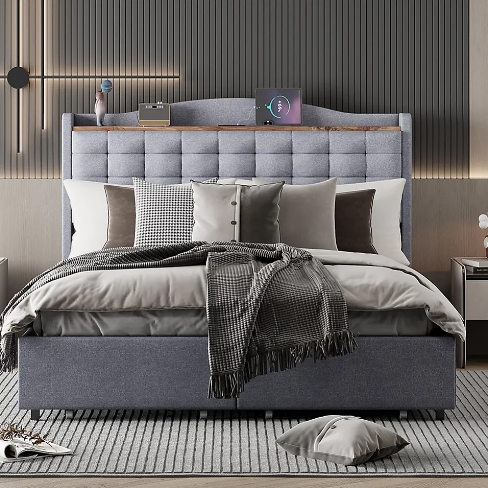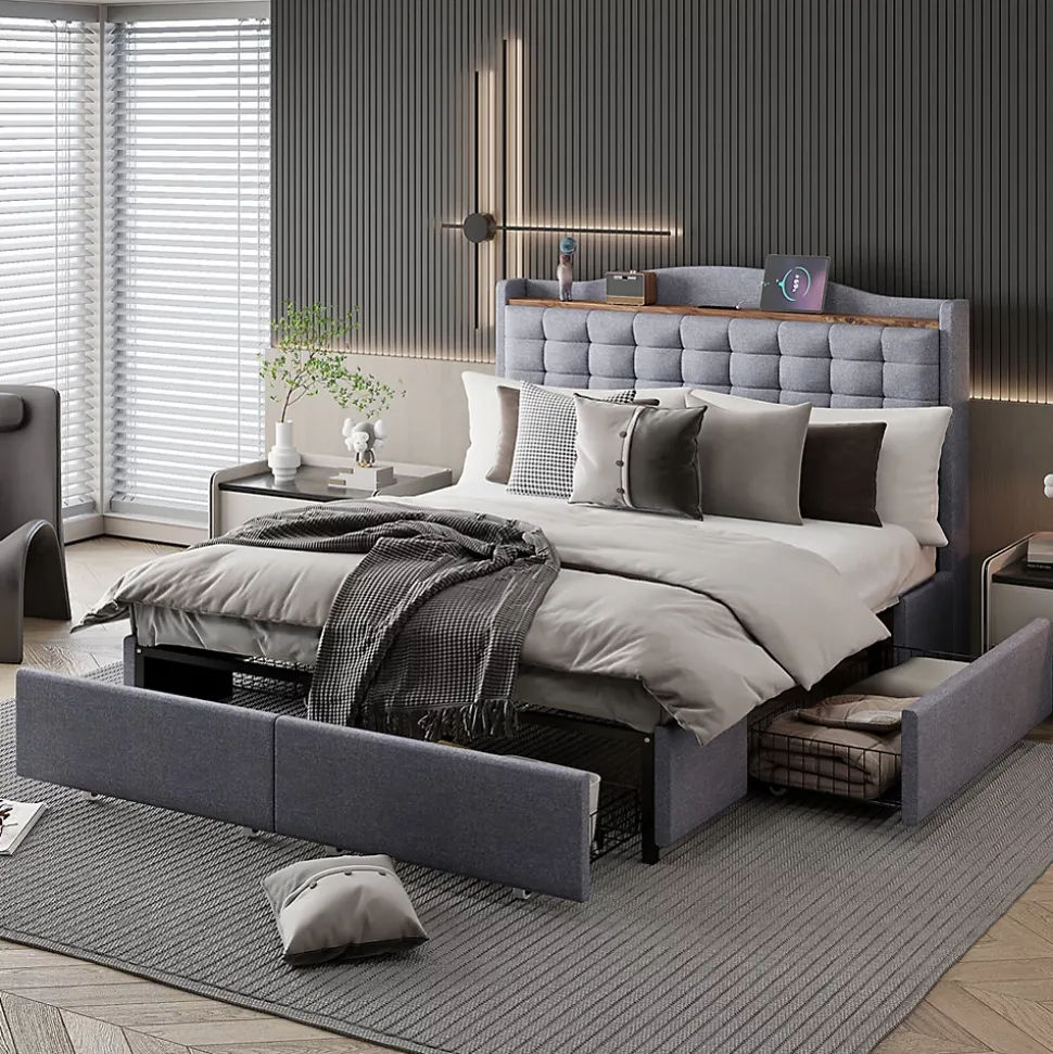 Lit polyvalent – Ce lit double rembourré est équipé d’un port de chargement USB intégré et d’un plateau au niveau de la tête de lit, vous permettant d’emporter facilement vos appareils et autres objets.Tissu en lin – Ce lit doux est enveloppé dans un élégant tissu en lin, qui est doux pour la peau et respirant, résistant à l’usure et déperlant, ajoutant une touche de sophistication à votre chambre.Grand espace de rangement – Ce lit plat est doté de quatre tiroirs surdimensionnés offrant beaucoup d’espace pour le linge de lit et les vêtements.Solide et robuste – La structure du cadre de ce lit plat est constituée de lattes en bois et de clips en métal, soutenus par de solides pieds en métal croisés capables de supporter une charge allant jusqu’à 300 kg. Il vous offre un environnement de sommeil confortable et sécurisé.Poids & Dimensions :Dimensions totales du produit : 200 x 146 x 110 cmDétails des dimensions du produit : Veuillez consulter l’image des taillesNombre de colis : 2Poids total du produit : 45 kgCapacité de poids : 300 kgÉpaisseur de matelas recommandée : 22-27 cmSpécifications :Type de produit : Lit modulaireTaille : 140 x 200 cmMatériau du produit : Tissu en lin + Métal + Contreplaqué + MDFNiveau de montage : Montage complet requis/Montage partielPoids total du colis : 47,6 kgNombre de lattes : 12Nombre de personnes recommandé : 2Outils supplémentaires requis : Tous les outils inclus/VisseuseÉvitez les outils électriques : Oui