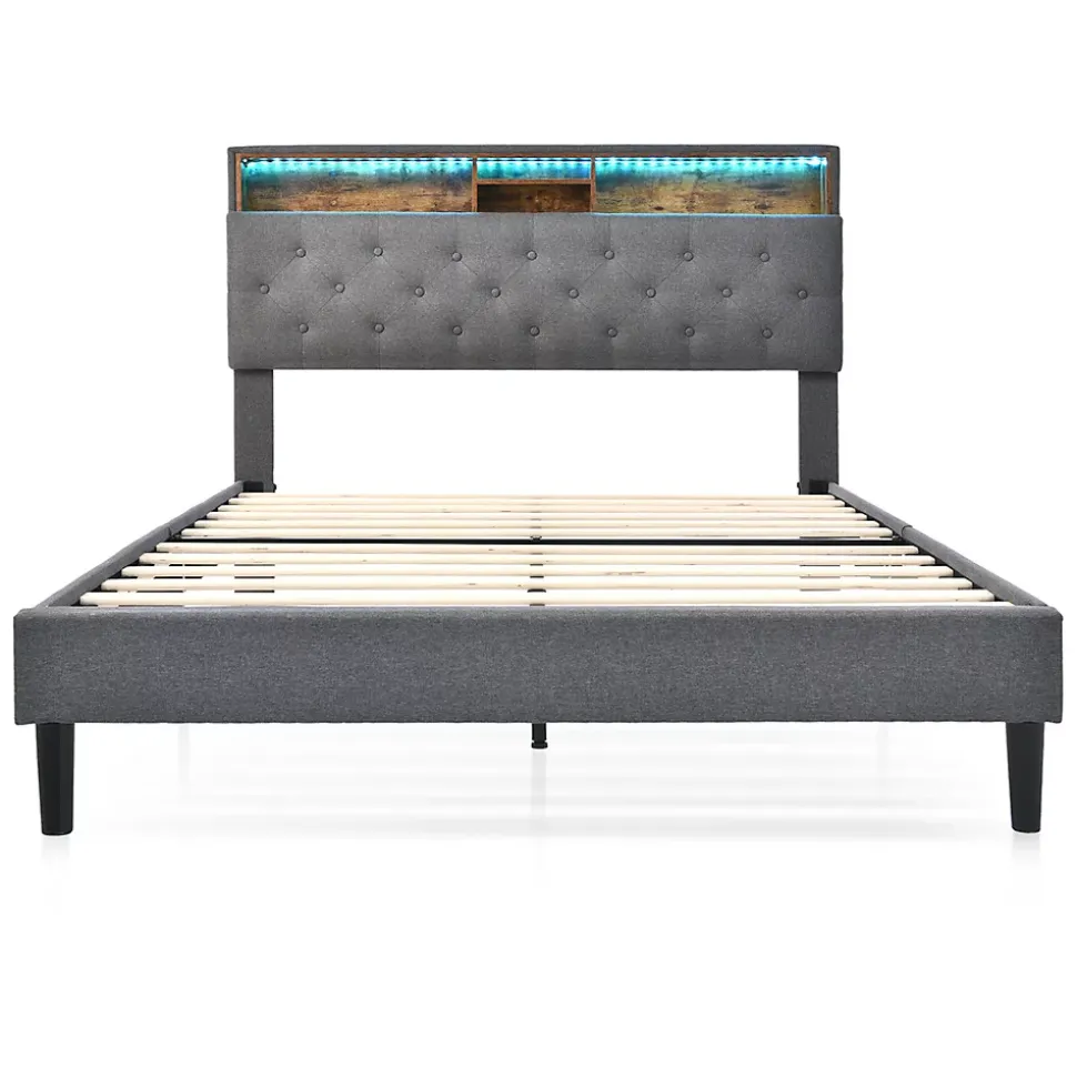 Dimensions totales :214x149x113(LxLxH)Capacité de charge :200KG/440LBSCouleur :grisMatériau :Bois massif+lin+métalSurface de couchage :140x200cmNombre de paquets : 2Poids net (kg) : 49.00kgMontage nécessaire : OuiMatelas inclus : NonRangement sur la tête de lit:Il s’agit d’un nouveau lit rembourré qui combine deux fonctions : Décoration LED et rangement. L’espace de rangement du lit est divisé en une zone interne et une zone externe, avec quatre compartiments externes de différentes capacités pour les objets de tous les jours. La partie rembourrée au centre du lit peut être ouverte pour ranger des objets plus volumineux.Bande LED intelligente:Contrairement aux LED ordinaires, ce lit est équipé de LED capables de recevoir une plus large gamme de signaux, d’une bande lumineuse qui change de couleur et d’un mode musical qui enrichit l’expérience du sommeil.Matériaux durables:Le matériau utilisé pour l’intérieur du lit est principalement du bois épais, qui est durable et a une capacité de charge de 440 LBS. Les pieds de soutien supplémentaires du poteau central peuvent assurer la stabilité fiable du lit.Des détails bien pensés:Le sommier à lattes est composé à 100 % de bois massif et de métal, offrant à la fois une capacité de charge élevée et un grand confort de sommeil. Les matériaux souples du lit garantissent non seulement une sensation agréable, mais réduisent aussi efficacement les dommages causés par les angles et les bords tranchants que vous ou votre famille pourriez subir lors de l’utilisation.Informations détaillées:Pour réduire le risque de dommages, ce cadre de lit est expédié dans 2 boîtes et ils peuvent arriver à des jours différents. Si les deux colis sont arrivés mais qu’il manque des pièces, veuillez contacter le service client et si vous déplacez le lit, veuillez le soulever au lieu de le traîner sur le sol.
