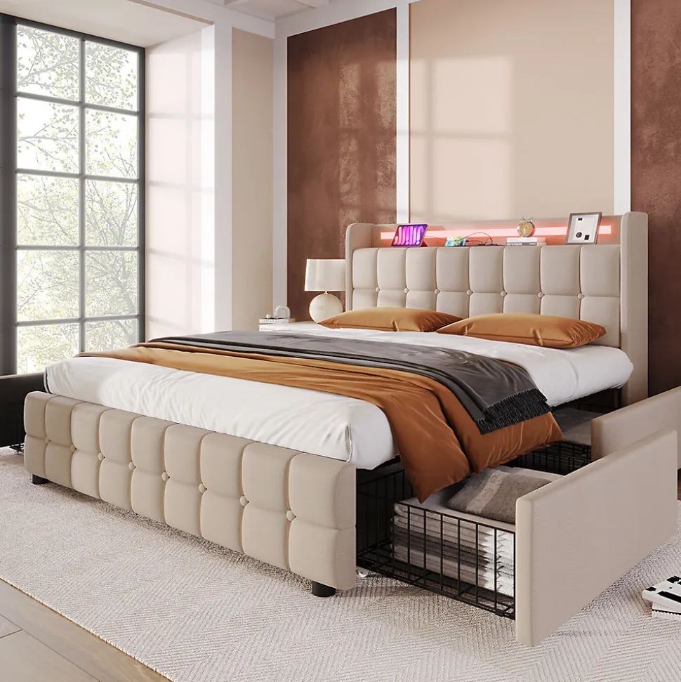 Dimensions totales :220×144.5x103cm(LxLxH)Capacité de charge :600LBSCouleur :BeigeMatériau :lin+FerNombre de paquets : 2Poids net :48.00kgMontage nécessaire : OuiMatelas inclus : NonTête de lit avec prises de courant et ports USB : L’une des caractéristiques les plus pratiques est la prise intégrée à la tête du lit, que vous pouvez utiliser pour recharger votre téléphone portable et votre tablette avant de vous coucher. Chaque prise est équipée de deux ports de charge aux normes européennes et de deux ports USB.Éclairage LED : L’éclairage LED ajoute un style moderne à votre chambre à coucher. Grâce à la télécommande, vous pouvez changer les différentes couleurs et la luminosité pour un couchage confortable.Rangement : Le lit est équipé de 4 tiroirs de grande capacité. Deux côtés du lit sont équipés de boucles de tiroir, qui permettent de fixer fermement le tiroir au lit lorsqu’il n’est pas utilisé, afin de garder votre chambre à coucher bien rangée. Les boîtes de rangement sont faciles à sortir et à rentrer grâce aux roulettes de la base.La praticité rencontre le design : Le lit harmonise habilement un design élégant et un confort maximal. Les boutons décoratifs affinent la tête de lit et lui donnent une touche moderne.Le cadre du lit est principalement en fer, il est durable et a une capacité de charge allant jusqu’à 600 LBS.Les pieds de soutien supplémentaires du pôle central peuvent assurer la stabilité fiable du lit.Informations détaillées : Pour réduire le risque de dommages, ce cadre de lit est expédié dans 2 boîtes et ils peuvent arriver à des jours différents. Si les deux colis sont arrivés mais qu’il manque des pièces, veuillez contacter le service client et si vous déplacez le lit, veuillez le soulever au lieu de le traîner sur le sol.Remarques :En raison des mesures manuelles, une erreur de 2 à 3 cm peut se produire.