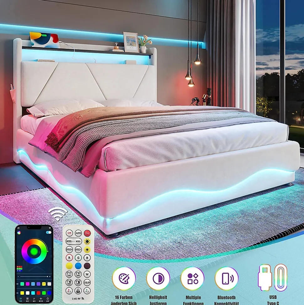 - Bande lumineuse LED – Un éclairage d’ambiance pour une atmosphère chaleureuse La bande lumineuse LED intégrée à la tête de lit crée un éclairage doux, idéal pour lire ou passer des soirées détendues. La couleur agréable de la lumière crée un environnement de sommeil apaisant et élégant. Un élément moderne pour chaque chambre à coucher avec un éclairage économe en énergie.