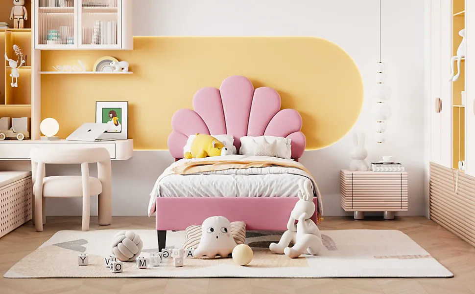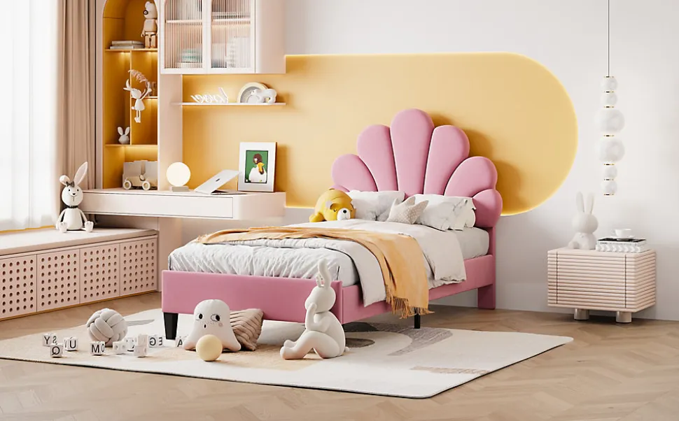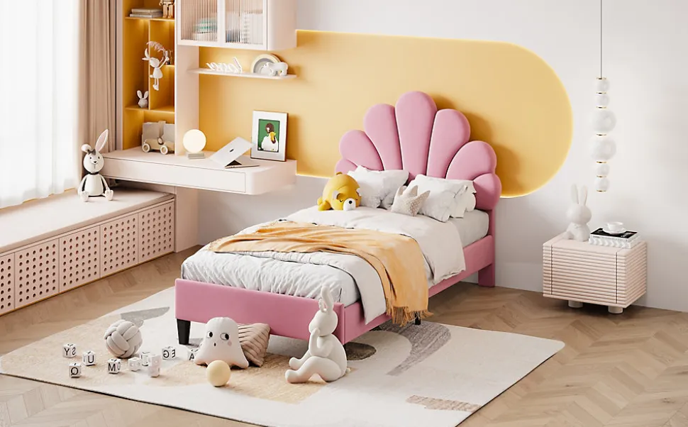 Design élégantCe lit rembourré en velours doux séduit par son design raffiné et intemporel. Sa tête de lit en forme de fleur apporte une touche romantique et s’intègre harmonieusement dans tout style de décoration intérieure.Structure solide et durableLe cadre du lit est fabriqué en MDF massif et panneaux de particules avec un support métallique en croix pour une stabilité optimale. Sa structure robuste peut supporter jusqu’à 200 kg, garantissant une utilisation sûre et durable.Confort sans sommier supplémentaireGrâce à ses 12 lattes renforcées, la matelas (non incluse) est parfaitement soutenue pour une répartition équilibrée du poids et un confort de sommeil supérieur. La tête de lit en velours sert également d’appui confortable pour la lecture ou la détente.Montage facileLe lit est livré avec une notice détaillée et tous les outils nécessaires pour un assemblage simple et rapide. Profitez d’une installation sans effort et d’un confort immédiat.Dimensions du produitDimensions totales : 206 x 100 x 110,5 cm (L x l x H). Convient pour un matelas de 90 x 200 cm (non inclus). Capacité de charge maximale : 200 kg.
