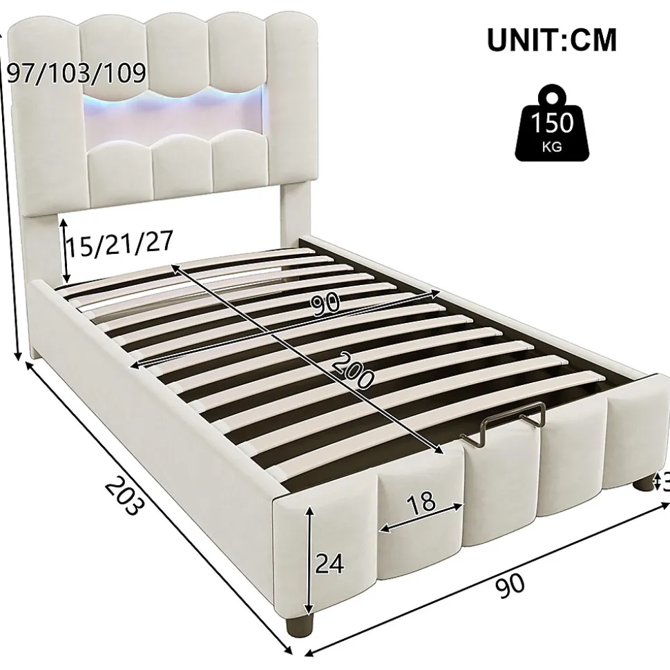 Caractéristiques du produitDimensions du colisSous-article 1 : 196,8 * 27,18 * 12,88 cm 15,9 kgSous-article 2 : 94,08 * 56,49 * 15,19 cm 20 kgInformations sur le produitMatériau du lit : velours + MDFTaille : 90 x 200 cmCouleur : beigeNombre de colis : 2Assemblage requis : ouiOrigine : ChineDimensions du produit : 203 x 90 x 109 cmDimensions du colis : veuillez consulter les spécificationsDimensions intérieures du lit : 90 x 200 cmHauteur totale : 109 cmCapacité de poids : 150 kgÉpaisseur recommandée du matelas (sans matelas) : 10-15 cmRemarques※ En raison des données de mesure manuelles, une erreur de 2 à 3 cm peut survenir.※ Toutes les photos des produits sont prises avec des produits réels, mais en raison de l’influence du rayonnement solaire et d’autres facteurs, certaines différences de couleur peuvent apparaître.※ Ce produit est divisé en 2 colis pour la livraison. Il est possible qu’ils n’arrivent pas en même temps. Veuillez patienter.※ Si vous avez des questions pendant l’installation, veuillez nous contacter dès que possible.