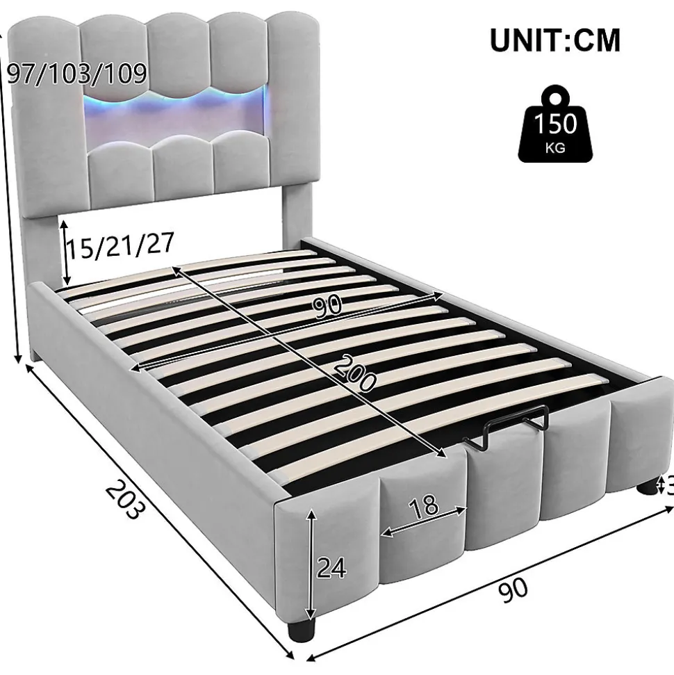Caractéristiques du produitDimensions de l’emballageSous-article 1 : 196,8 * 27,18 * 12,88 cm 15,9 kgSous-article 2 : 94,08 * 56,49 * 15,19 cm 20 kgInformations sur le produitMatériau du lit : velours + MDFTaille : 90 x 200 cmCouleur : grisNombre de colis : 2Assemblage requis : ouiOrigine : ChineDimensions du produit : 203 x 90 x 109 cmDimensions du colis : veuillez consulter les spécificationsDimensions intérieures du lit : 90 x 200 cmHauteur totale : 109 cmCapacité de poids : 150 kgÉpaisseur recommandée du matelas (sans matelas) : 10-15 cmRemarques※ En raison des données de mesure manuelles, une erreur de 2 à 3 cm peut survenir.※ Toutes les photos des produits sont prises avec des produits réels, mais en raison de l’influence du rayonnement solaire et d’autres facteurs, certaines différences de couleur peuvent apparaître.※ Ce produit est divisé en 2 colis pour la livraison. Il est possible qu’ils n’arrivent pas en même temps. Veuillez patienter.※ Si vous avez des questions pendant l’installation, veuillez nous contacter dès que possible.