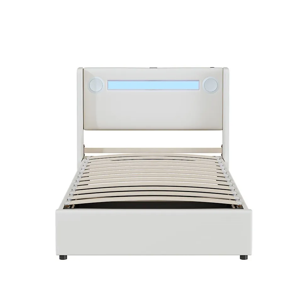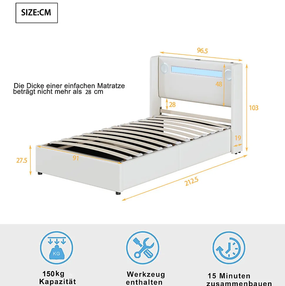 Dimensions totales :212.5×96.5×103 cm (LxPxH)Capacité de charge :150 kgCouleur :blancMatériau :Panneau composite de fibres de bois à densité + métal + cuir PUSurface de couchage :90×200 cmNombre de paquets : 2Poids net :36.00kgMontage nécessaire : OuiMatelas inclus : NonFabriqué en cuir PU :Ce lit est fabriqué en cuir PU, qui est hydrofuge et anti-salissures et facile à nettoyer.Lit multifonctionnel :Ce lit rembourré est équipé d’un lecteur Bluetooth et de 2 ports de charge pour vous faciliter la vie. Le haut-parleur Bluetooth sans fil se connecte à votre téléphone portable pour diffuser de la musique et la barre lumineuse bat au rythme de la musique, créant ainsi un espace de sommeil parfait pour vous.Espace de rangement extra large :Ce lit avec rangement est doté d’un mécanisme de levage hydraulique double facile à utiliser et l’espace de rangement extra large disponible sous le lit est parfait pour les petites maisons ou les appartements avec un espace limité.Construction solide et durable :Ce lit avec rangement est doté d’un cadre en acier et d’un système de support de lattes en bois robuste, ce qui le rend durable et silencieux. Il peut supporter un poids allant jusqu’à 150 kg sans nécessiter de sommier ou de base de matelas.Cadre de lit facile à assembler :Les dimensions totales du lit sont de 212,5 x 96,5 x 103 cm. Le lit est expédié en deux colis. Il arrive que les deux colis n’arrivent pas le même jour. Veuillez patienter 2 ou 3 jours supplémentaires ou contacter l’un de nos sympathiques représentants du service clientèle pour obtenir de l’aide.Remarques :En raison des mesures manuelles, une erreur de 2 à 3 cm peut se produire.En raison de la lumière, il peut y avoir des différences de couleur entre l’image du produit et le produit réel.Veuillez vous référer au produit que vous avez réellement reçu.