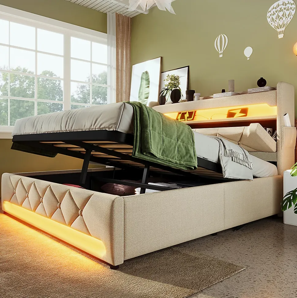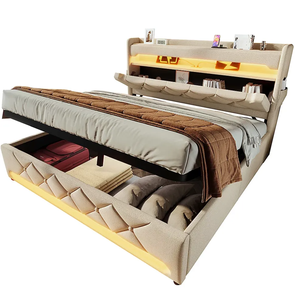 Couleur : BeigeDimensions totales : 225x146x111cm(LxLxH)Matériau des panneaux : LinPoids brut/poids net (KG) : 57.2/52.2 KGMax. Poids de l’utilisateur : 250kg/551lbsMatelas applicable (matelas non inclus) : 140×200 CMEpaisseur recommandée du matelas : 25cmType de charge : USBx3+Type Cx1Assemblage requis : OuiContenu de l’emballage : Cadre de lit+fonction de charge+LEDQuantité du paquet : 2Éclairage LED innovant:Vous pouvez contrôler la barre via un bouton/APP/télécommande pour créer un spectacle lumineux impressionnant avec de la musique et des dizaines de milliers de couleurs de lumière pour vous donner une atmosphère de sommeil étonnante.Tête de lit de rangement avec chargeur en vedette:Il y a trois prises USB à la tête du lit ainsi qu’un port de charge de type C. L’une des prises USB est une prise de charge rapide.Espace de rangement sur plusieurs niveaux:Surfaces de rangement sur le lit pour les objets du quotidien, les téléphones portables ou les tablettes, avec un espace de rangement ouvert à la tête du lit ; deux poches de rangement latérales sur le côté du lit pour les objets à portée de main ; espace de rangement hydraulique sous le lit, l’espace de rangement peut être facilement ouvert à l’aide de sangles de traction.Construction solide:Le cadre principal est en fer pour assurer la stabilité du lit et la capacité de charge de 551 lbs. Les points de contact du cadre sont équipés de patchs silencieux EVA pour réduire le bruit, et le lit a une barre d’arrêt à l’extrémité de la tête afin que le matelas ne soit pas facile à glisser, offrant aux clients une expérience de sommeil confortable.