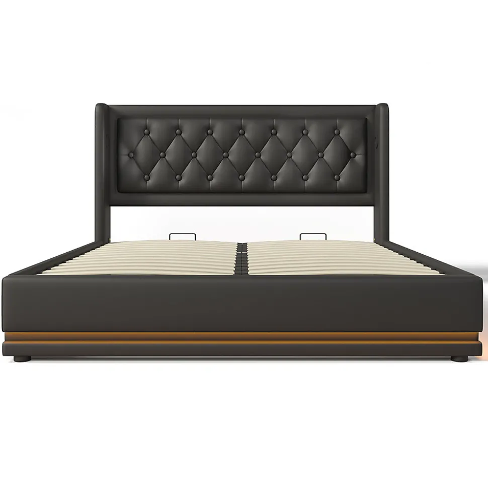 Dimensions totales :210x190x100.5cm(LxLxH)Capacité de charge :300KG/660LBSCouleur :noirMatériau :PU+métalNombre de paquets : 2Poids net :50.23kgMontage nécessaire : OuiMatelas inclus : NonStyle classique et design pratique :La tête de lit présente un design classique et touffeté avec des boutons pour soutenir délicatement votre cou et créer un environnement de sommeil douillet.Grâce aux ports de charge USB et Type-C situés de part et d’autre du vous pouvez utiliser vos appareils électroniques au lit quand vous le souhaitez sans craindre d’être à court de batterie.Espace de rangement sous le lit :Le lit relevable avec rangement est doté d’une conception unique d’élévateur hydraulique à air de haute qualité qui offre un vaste espace de rangement sous le lit et peut être facilement relevé, abaissé ou fermé.Le dessous du lit est recouvert d’un tissu non tissé qui empêche la poussière de pénétrer et garde les choses en ordre.Système de soutien solide :Le cadre du lit est fabriqué en acier de haute qualité et les pieds renforcés empêchent la structure de se tordre. La surface est peinte, elle ne se déforme pas et ne rouille pas. Cadre en acier de haute qualité avec des lattes élastiques de haute qualité pour soutenir le dos et fournir une bonne expérience de sommeil, le lit est livré avec une barre d’arrêt pour empêcher le matelas de glisser.Éclairage LED innovant :La bande lumineuse LED à 3 côtés du lit, au design innovant, permet de changer 16 couleurs. Vous pouvez régler différents modes de clignotement et de luminosité pour créer un spectacle lumineux impressionnant entouré de trois côtés pour vous donner une atmosphère de sommeil impressionnante.Ce lit est disponible en deux couleurs :PU blanc, PU noir ; le tissu PU est facile à nettoyer. Chaque couleur a quatre tailles : 90x200cm/140x200cm/160x200cm/180x200cm.