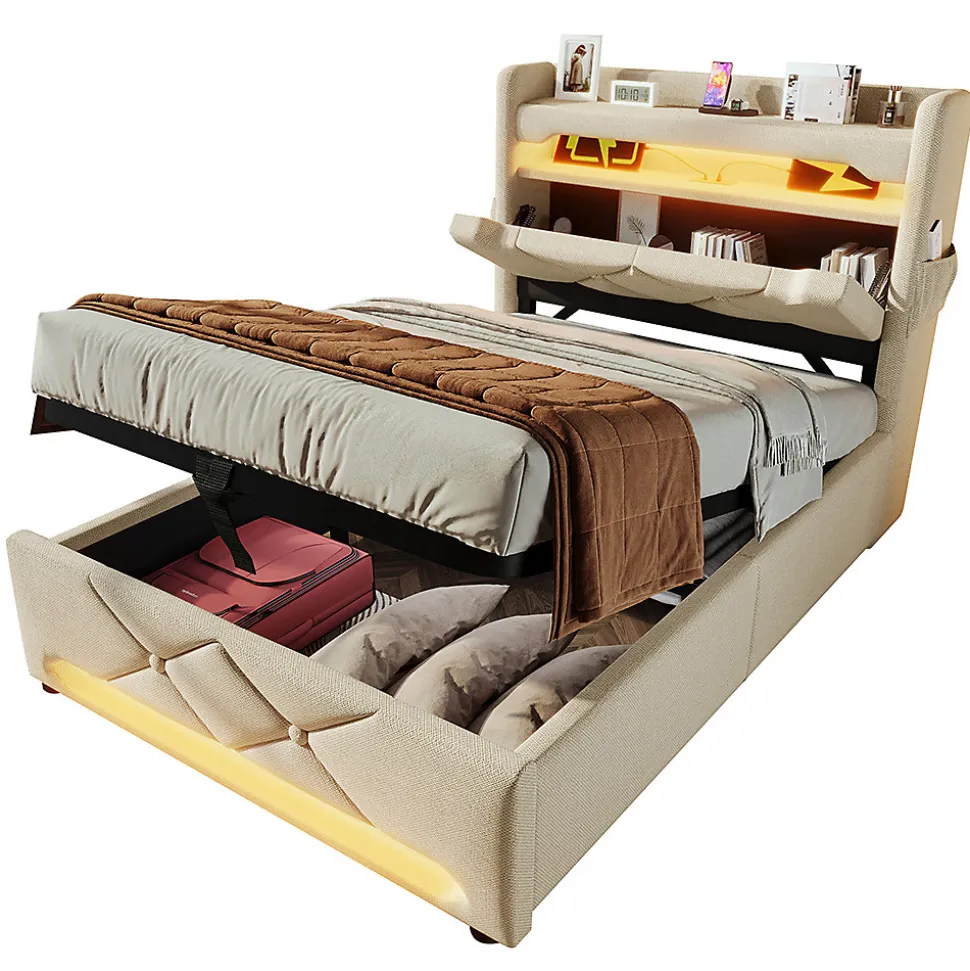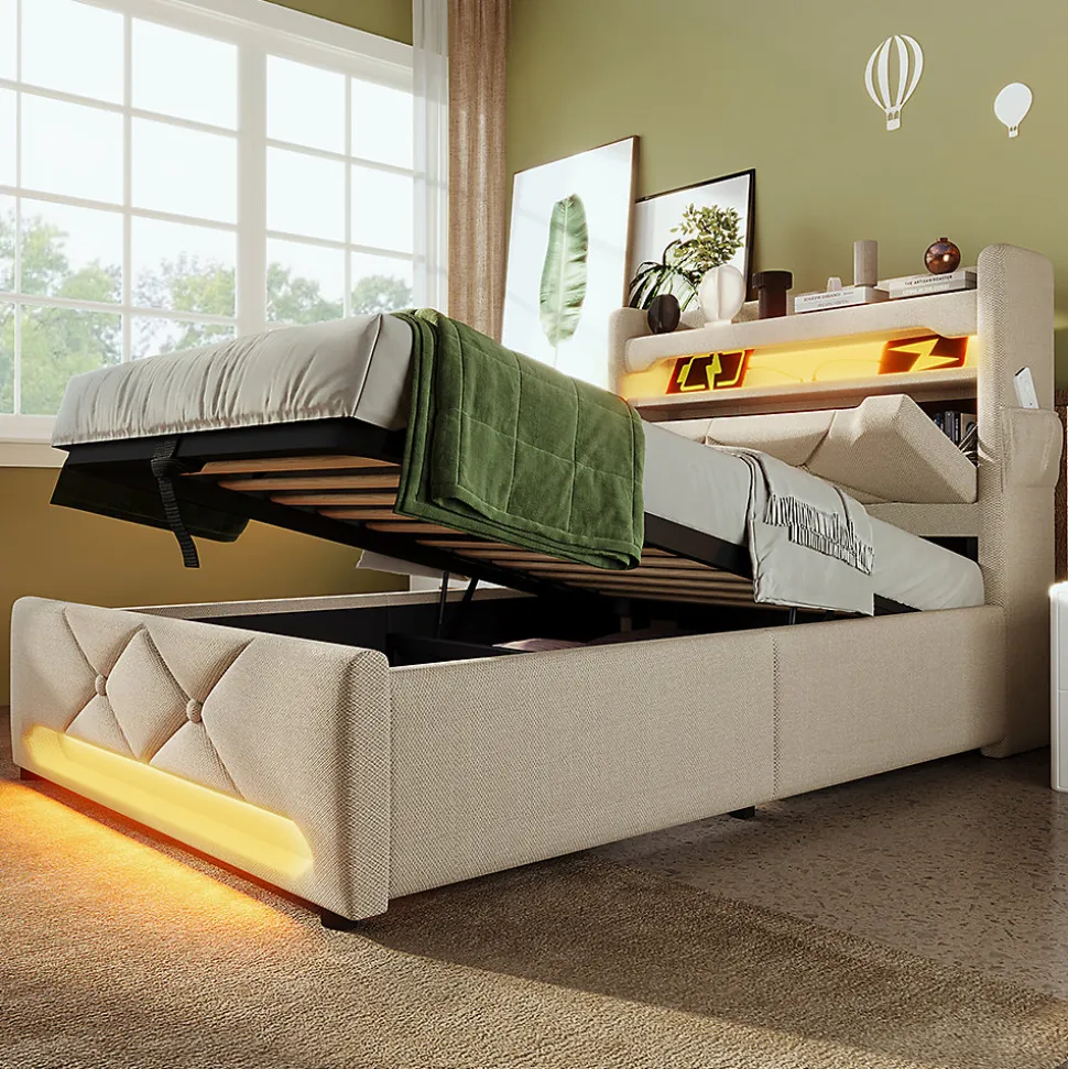 Couleur : BeigeDimensions totales : 225x96x111cm(LxLxH)Matériau du panneau : LinMax. Poids de l’utilisateur : 150KG/330LBSPoids brut/poids net (KG) : 47,6/42,6 KGMatelas applicable (matelas non inclus) : 90×200 CMEpaisseur recommandée du matelas : 25cmType de charge : USBx3+Type Cx1Assemblage requis : OuiContenu de l’emballage : Cadre de lit+fonction de charge+LEDQuantité du paquet : 2Éclairage LED innovant:Vous pouvez contrôler la barre via un bouton/APP/télécommande pour créer un spectacle lumineux impressionnant avec de la musique et des dizaines de milliers de couleurs de lumière pour vous donner une atmosphère de sommeil étonnante.Tête de lit de rangement avec chargeur en vedette:Il y a trois prises USB à la tête du lit ainsi qu’un port de charge de type C. L’une des prises USB est une prise de charge rapide.Espace de rangement sur plusieurs niveaux:Surfaces de rangement sur le lit pour les objets du quotidien, les téléphones portables ou les tablettes, avec un espace de rangement ouvert à la tête du lit ; deux poches de rangement latérales sur le côté du lit pour les objets à portée de main ; espace de rangement hydraulique sous le lit, l’espace de rangement peut être facilement ouvert à l’aide de sangles de traction.Construction solide:Le cadre principal est en fer pour assurer la stabilité du lit et la capacité de charge de 330lbs. Les points de contact du cadre sont équipés de patchs silencieux EVA pour réduire le bruit, et le lit a une barre d’arrêt à l’extrémité de la tête afin que le matelas ne soit pas facile à glisser, offrant aux clients une expérience de sommeil confortable.