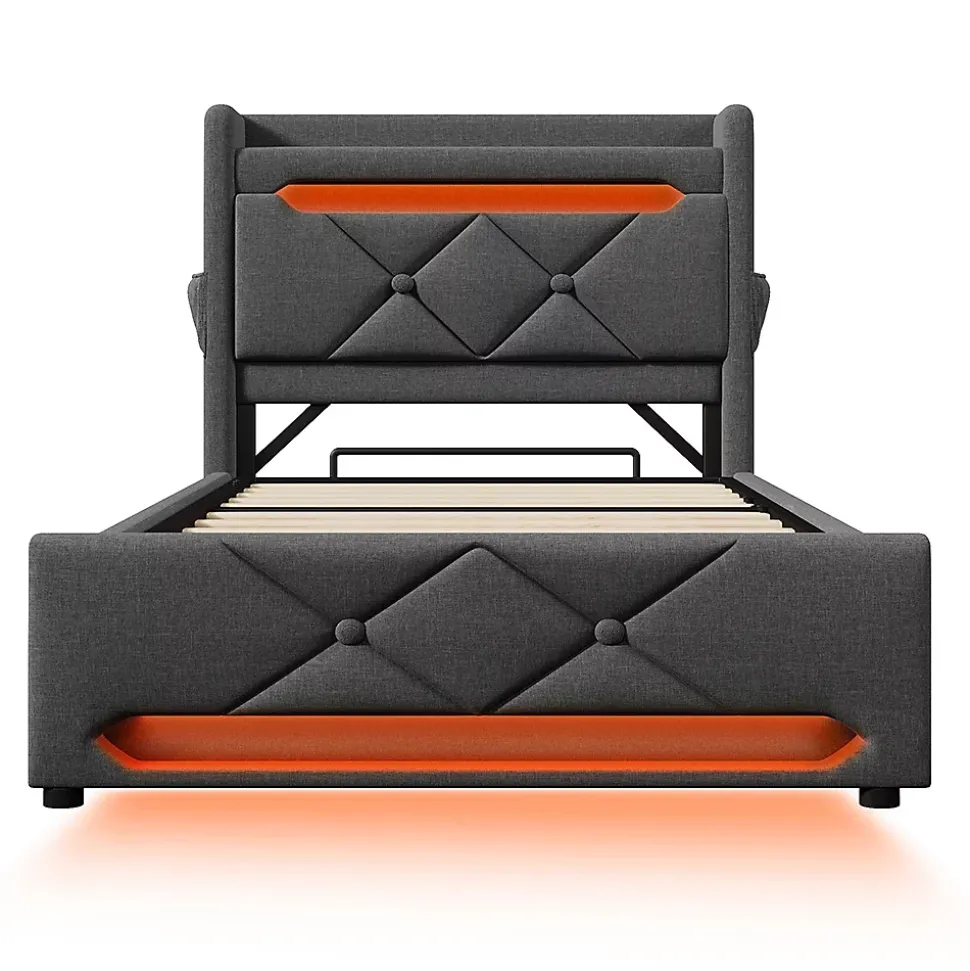 Couleur:GrisDimensions totales:225x96x111cm(LxLxH)Matériau du panneau:LinMax. Poids de l’utilisateur:150KG/330LBSPoids brut/poids net:47,6/42,6 KGMatelas applicable (matelas non inclus):90x200CMEpaisseur recommandée du matelas:25cmType de charge:USBx3+Type Cx1Assemblage requis:OuiContenu de l’emballage:Cadre de lit+fonction de charge+LEDQuantité du paquet:2Éclairage LED innovant:Vous pouvez contrôler la barre via un bouton/APP/télécommande pour créer un spectacle lumineux impressionnant avec de la musique et des dizaines de milliers de couleurs de lumière pour vous donner une atmosphère de sommeil étonnante.Tête de lit de rangement avec chargeur en vedette:La tête de lit boutonnée ne garantit pas seulement une nuit de sommeil confortable et un beau design, l’une des caractéristiques les plus utiles est la prise intégrée à la tête du lit, que vous pouvez utiliser pour charger votre téléphone portable et votre tablette avant d’aller au lit. Il y a trois prises USB à la tête du lit ainsi qu’un port de charge de type C. L’une des prises USB est une prise de charge rapide.Espace de rangement sur plusieurs niveaux:Surfaces de rangement sur le lit pour les objets du quotidien, les téléphones portables ou les tablettes, avec un espace de rangement ouvert à la tête du lit ; deux poches de rangement latérales sur le côté du lit pour les objets à portée de main ; espace de rangement hydraulique sous le lit, l’espace de rangement peut être facilement ouvert à l’aide de sangles de traction.Construction solide:Le cadre principal est en fer pour assurer la stabilité du lit et la capacité de charge de 330lbs. Les points de contact du cadre sont équipés de patchs silencieux EVA pour réduire le bruit, et le lit a une barre d’arrêt à l’extrémité de la tête afin que le matelas ne soit pas facile à glisser, offrant aux clients une expérience de sommeil confortable.