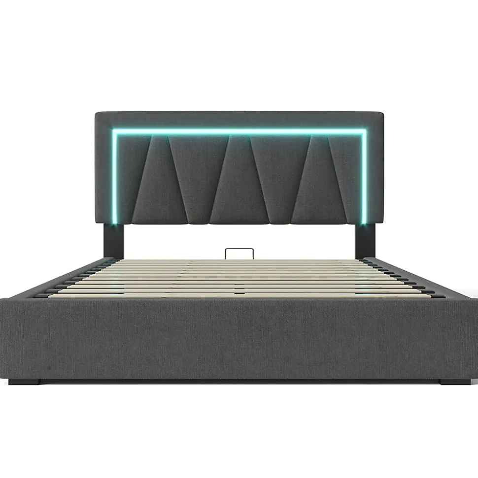 Dimensions totales :208×146.5×90.5-110.5cm(LxLxH)Capacité de charge :360kg/793lbsCouleur :grisMatériau :linPoids brut/poids net :50/47.2kgNombre de paquets : 2Montage nécessaire : OuiType de matelas :Sans matelasTête de lit réglable en hauteur :La tête de lit rembourrée de forme géométrique donne à la chambre à coucher une touche de modernité. La hauteur de la tête de lit est réglable, et la plage de réglage est d’environ 20 cm.L’épaisseur du matelas applicable est d’environ 12 à 32 cm.Station de recharge avec connexion USB : L’une des caractéristiques les plus utiles est la prise USB intégrée à la tête du lit, qui dispose à la fois d’un port USB intégré et d’un port de type C, ce qui vous permet de recharger votre téléphone portable et votre tablette avant d’aller vous coucher.Éclairage LED : L’éclairage LED à la tête du lit ajoute une touche de modernité à votre chambre. Grâce à la télécommande, vous pouvez modifier les différentes couleurs, vitesses et luminosités pour créer une atmosphère unique pour votre temps de repos, en fonction de votre humeur.La praticité rencontre le design : Le lit harmonise habilement un design élégant et un confort maximal. Les boutons décoratifs affinent la tête de lit et lui donnent une touche de modernité.Le cadre du lit est principalement en fer, il est durable et a une capacité de charge allant jusqu’à 793 LBS.Les pieds de soutien supplémentaires du pôle central peuvent assurer la stabilité fiable du lit.Espace de rangement flexible et spacieux : Les téléphones portables peuvent être rangés à la tête du lit. Soutenu par des vérins à gaz, l’espace sous le sommier à lattes peut être utilisé pour ranger des objets de grande taille. Le sommier à lattes peut être facilement relevé en soulevant les bandes de tissu.Informations détaillées :Si vous déplacez le lit, veuillez le soulever au lieu de le traîner sur le sol.