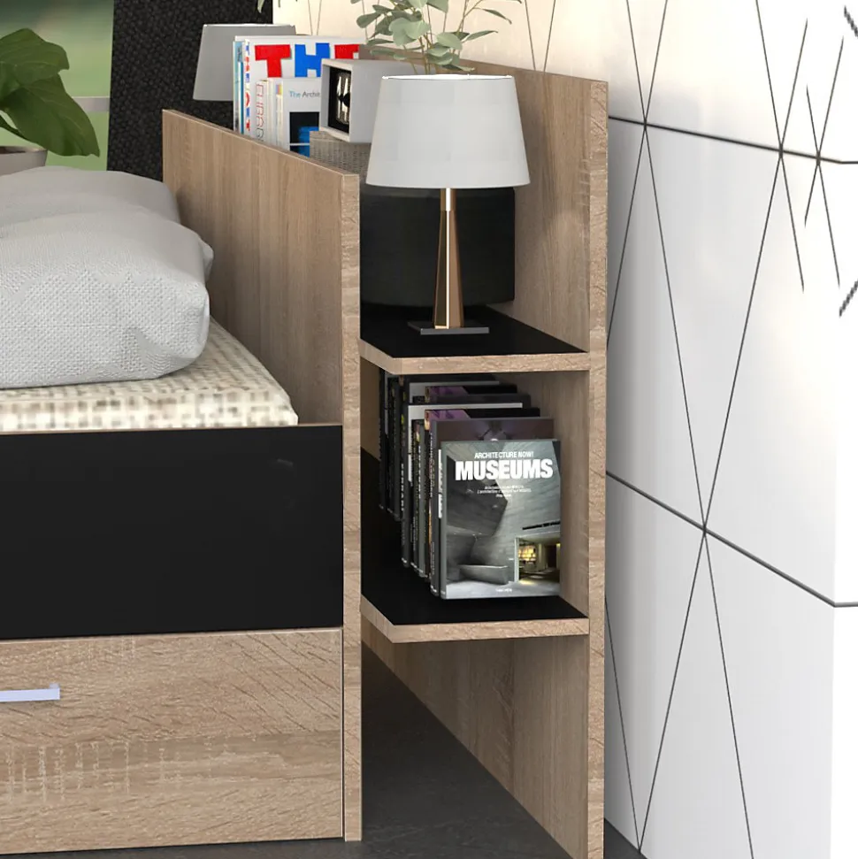 Lit SAMBA 140x190cm + tête de lit étagère + 2 tiroirs de rangementLe lit SAMBA vous offre un maximum d’espaces de rangement grâce à sa tête de lit étagère ainsi que ses deux tiroirs montés sur roulettes. Quel bonheur d’avoir plus de rangements sans sacrifier des mètres carrés !Caractéristiques : Cadre: Structure en panneau de particulesFinition: Noir et chêne blanchiDimensions intérieures du tiroir latéral : L148xP33xH18 cmDimensions intérieures du tiroir central : L137xP32xH18 cmLivré démonté, sans sommier, sans matelas. Prévoir un sommier à cadre. A monter soi-mêmeDimensions:216x180x80