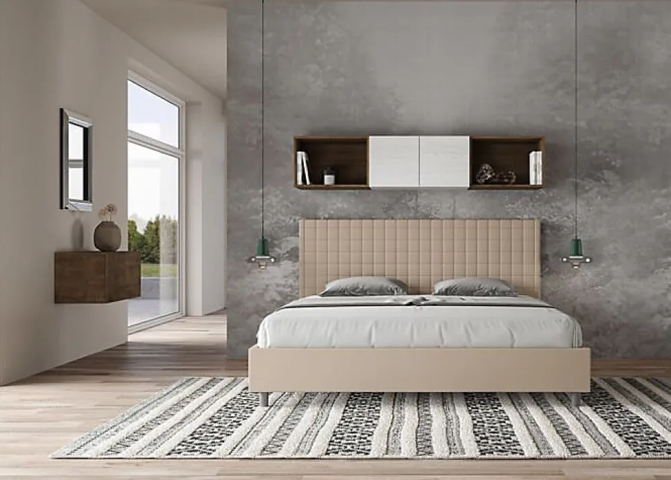 Lit king size Sunny 180×190 avec tête de lit et lit rembourrés, revêtement en simili cuir, particulièrement polyvalent et facilement combinable avec n’importe quel style d’ameublement.Le lit king size Sunny 180×190 se caractérise par un style moderne et élégant, mis en valeur par la tête de lit matelassée recouverte de simili cuir.La présence du matériau en simili cuir, en plus de donner à la pièce une atmosphère accueillante et invitante, offre la commodité d’un nettoyage rapide et facile, grâce à l’utilisation d’un simple chiffon en microfibre.Lit fourni avec sommier à lattes, prévu pour un matelas 180×190 cm – Matelas non inclusCouvre-lit non amovible.Produit ItyhomeFabriqué en ItalieDimensions lit : L.195 P.210 H.122 cmHauteur des pieds : 12 cmHauteur du lit : 27 cmHauteur du filet depuis le sol : 39 cm