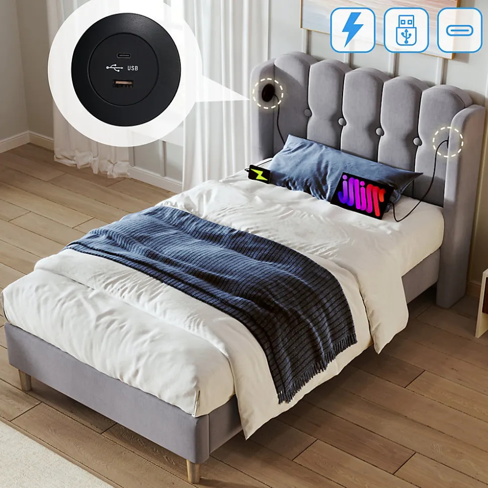 ▶ ▶ Détails ▶────────────────● Nom du produit : Lit double avec fonction de chargement USB Type C● Dimensions totales : 103x208x103 cm ( l x L x H)● Matériau : Lin + MDF + Métal● Couleur : Gris● Poids maximal supporté : 158 kg● Distance entre l’appui-tête : 25 cm● Sommier requis : Non● Contenu du colis : Cadre de lit + Fonction de chargement USB Type C● Design unique : Fonction de chargement USB Type C● Taille du matelas applicable (matelas non inclus) : 90×200 cm● Poids brut/net (kg) : 32.2 / 29 kg● Montage requis : Oui● Nombre de colis : 2► Remarques ►※ Ce produit sera livré en 2 colis. Ils peuvent ne pas arriver en même temps. Merci de patienter.※ En raison des mesures manuelles, une erreur de 2-3 cm peut se produire.※ En raison de la lumière, il peut y avoir des différences de couleur entre l’image du produit et le produit réel. Merci de vous référer au produit effectivement reçu.※ Si vous avez des questions lors de l’installation, veuillez nous contacter dès que possible.
