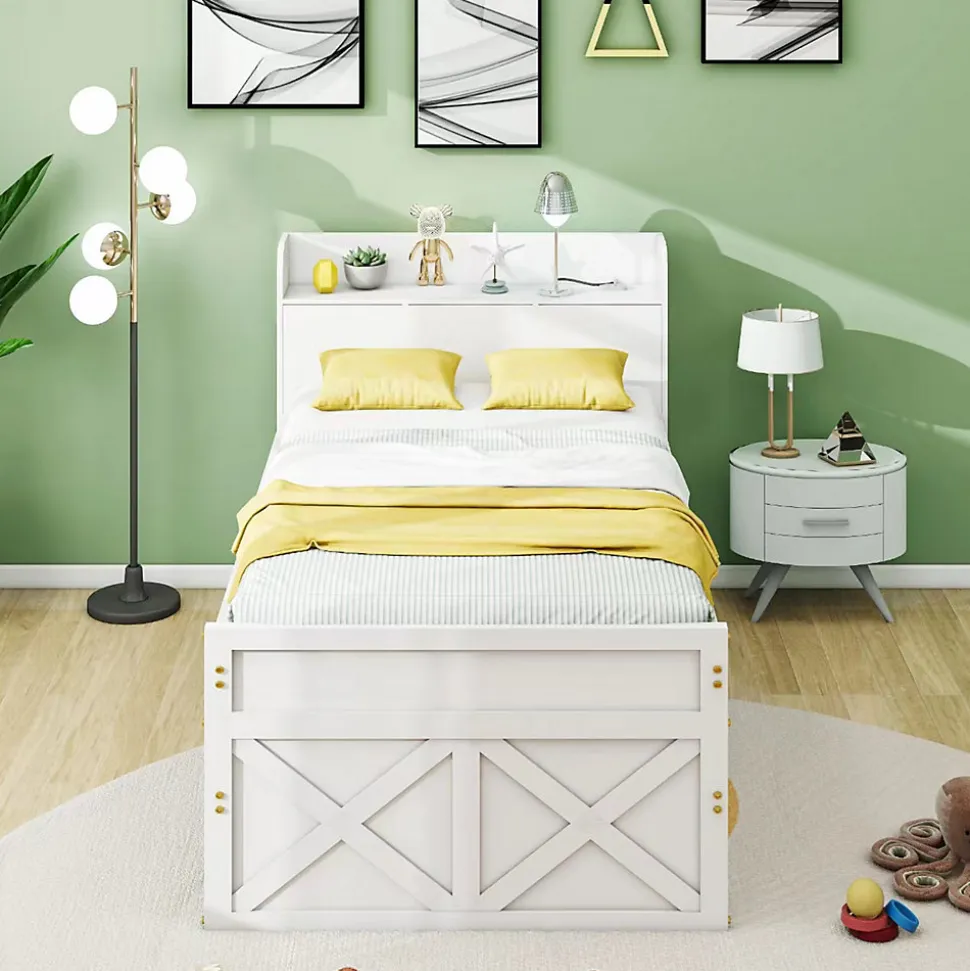 1. Table de chevet avec compartiment de rangement et port USB – Ce lit en bois mesure 190 x 90 cm. La table de chevet est équipée d’un compartiment de rangement qui s’ouvre pour un rangement pratique. Bien organisée, elle offre une grande capacité de rangement. Le port USB intégré au lit permet de recharger vos appareils au quotidien. 2. Lit gigogne et tiroirs – Ce lit répond efficacement à vos besoins d’espace. En plus du lit principal gigogne, un lit gigogne se trouve en dessous. De plus, ce lit dispose de deux tiroirs intégrés qui répondent à vos besoins de rangement tout en optimisant l’espace. 3. Lit en bois multifonctionnel – La conception de ce lit en bois maximise l’espace de votre chambre. Il offre non seulement un espace de couchage confortable, mais la table de chevet peut également servir de rangement, de support pour vos objets et de point de recharge pour vos appareils. Ce lit est également équipé d’un lit gigogne et de tiroirs, vous permettant ainsi de maximiser votre espace. 4. Grand espace de rangement – Ce lit dispose non seulement d’un compartiment de rangement dans la tête de lit, mais aussi de deux tiroirs de rangement pour répondre facilement à vos besoins de rangement. 5. Cadre de lit facile à monter – Les dimensions totales du lit sont de 213 x 94,5 x 105 cm avec un sommier à lattes (matelas non inclus). Ce lit en bois, avec poignées et tiroirs, est expédié d’Allemagne en deux colis, qui peuvent parfois ne pas arriver le même jour. Nous vous remercions de votre patience et vous prions de bien vouloir patienter 2 à 3 jours supplémentaires.
