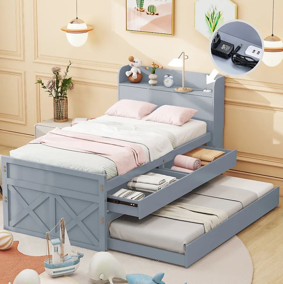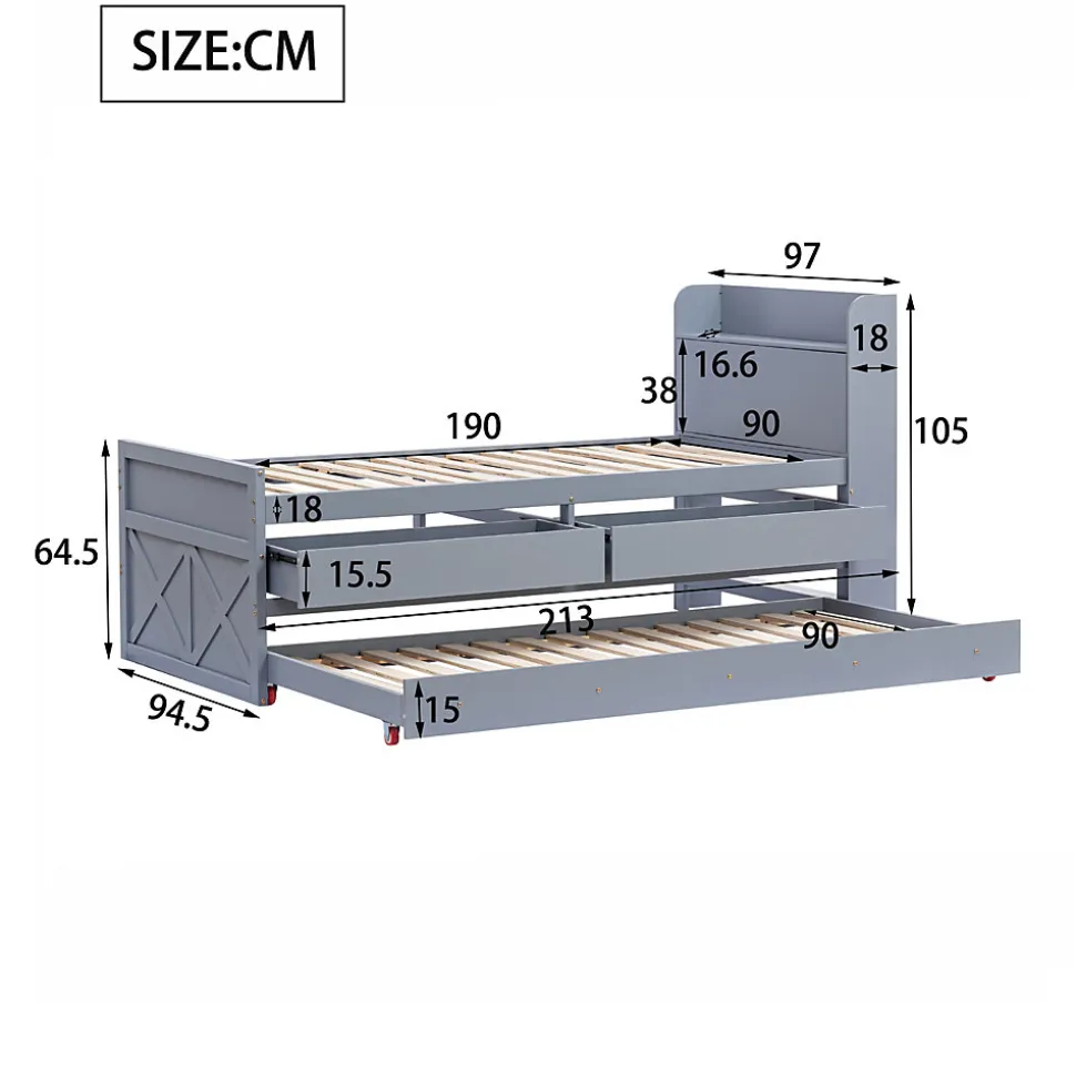 ▶ ▶ Détails ▶────────────────● Type de lit : Lit en bois avec tiroir escamotable et port USB● Dimensions du produit (L x l x H) : 213 x 94,5 x 105 cm● Taille du matelas compatible : 90 x 190 cm (Sans Matelas)● Couleur : Gris● Matériau : Bois massif● Niveau de montage : Assemblage complet requis / Montage partiel● Poids total du produit : 44 KG● Poids total des colis : 50 KG● Nombre de lattes : 30● Temps estimé de montage : 0,5 heure● Nombre recommandé de personnes : 2● Outils supplémentaires nécessaires : Tous les outils inclus / Tournevis● Outils électriques : Non requis● Nombre de colis : 2► Remarques ►※ Ce produit est livré en 2 colis qui peuvent arriver séparément. Merci de patienter.※ Les mesures étant manuelles, une marge d’erreur de 2-3 cm peut exister.※ Les couleurs peuvent varier en raison de l’éclairage entre les images du produit et le produit réel. Veuillez vous référer au produit reçu.※ Si vous avez des questions lors de l’installation, contactez-nous dès que possible.