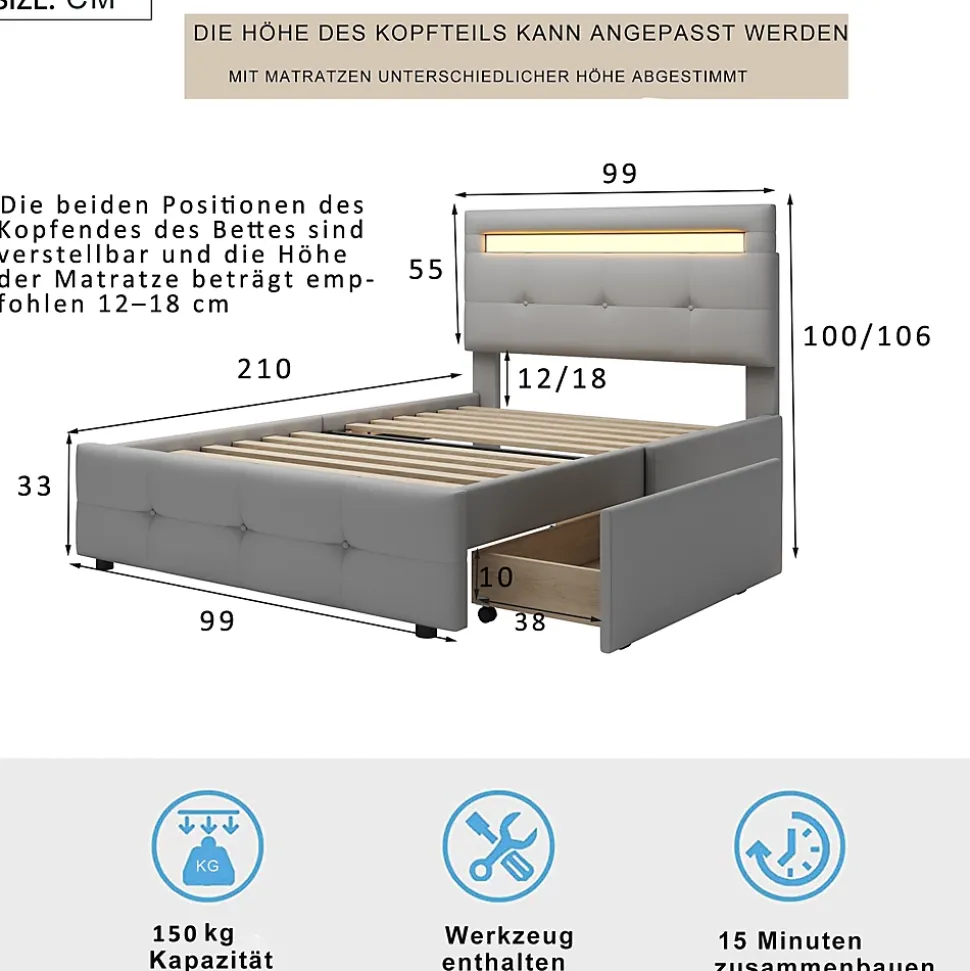 ▶ ▶ Détails ▶────────────────● Nom du produit : Lit simple● Dimensions du produit : 210 x 99 x 106 cm● Dimensions détaillées : Veuillez vous référer à l’image des dimensions● Nombre de colis : 2● Poids total du produit : 37 kg● Poids maximal utilisateur : 150 kg● Nombre de lattes : 12● Matrice recommandée : 12-18 cm (matelas non inclus)● Type de produit : Lit rembourré avec 2 tiroirs● Dimensions du lit : 200 x 90 cm● Couleur : Gris● Matériaux : Lin, Bois, Métal● Montage requis : Oui● Matelas inclus : Non● Temps estimé pour le montage : 1 heure● Outils supplémentaires nécessaires : Tous les outils sont inclus / Tournevis● Évitez les outils électriques : Oui► Remarques ►※ En raison des mesures manuelles, un écart de 2 à 3 cm peut survenir.※ Ce produit est expédié en 2 colis. Ils peuvent ne pas arriver en même temps. Veuillez patienter.※ En raison des conditions d’éclairage, il peut y avoir des différences de couleur entre l’image du produit et le produit réel. Veuillez vous référer au produit que vous recevez réellement.※ Si vous avez des questions lors de l’installation, veuillez nous contacter dès que possible.