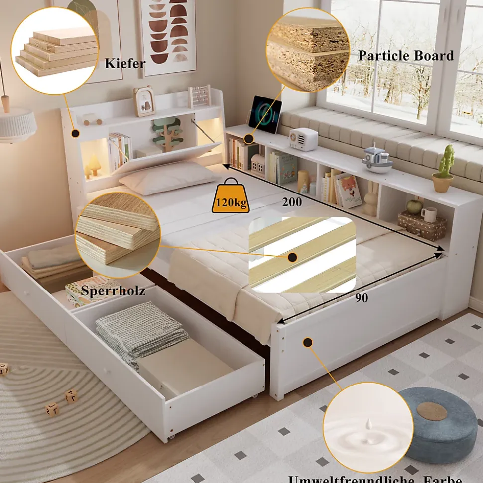 - 【Solutions de rangement étendues】 Le lit offre un espace de rangement intelligent avec tête de lit, armoires latérales et deux tiroirs généreux, facilitant l’organisation des vêtements, accessoires et objets du quotidien tout en gardant l’espace ordonné.