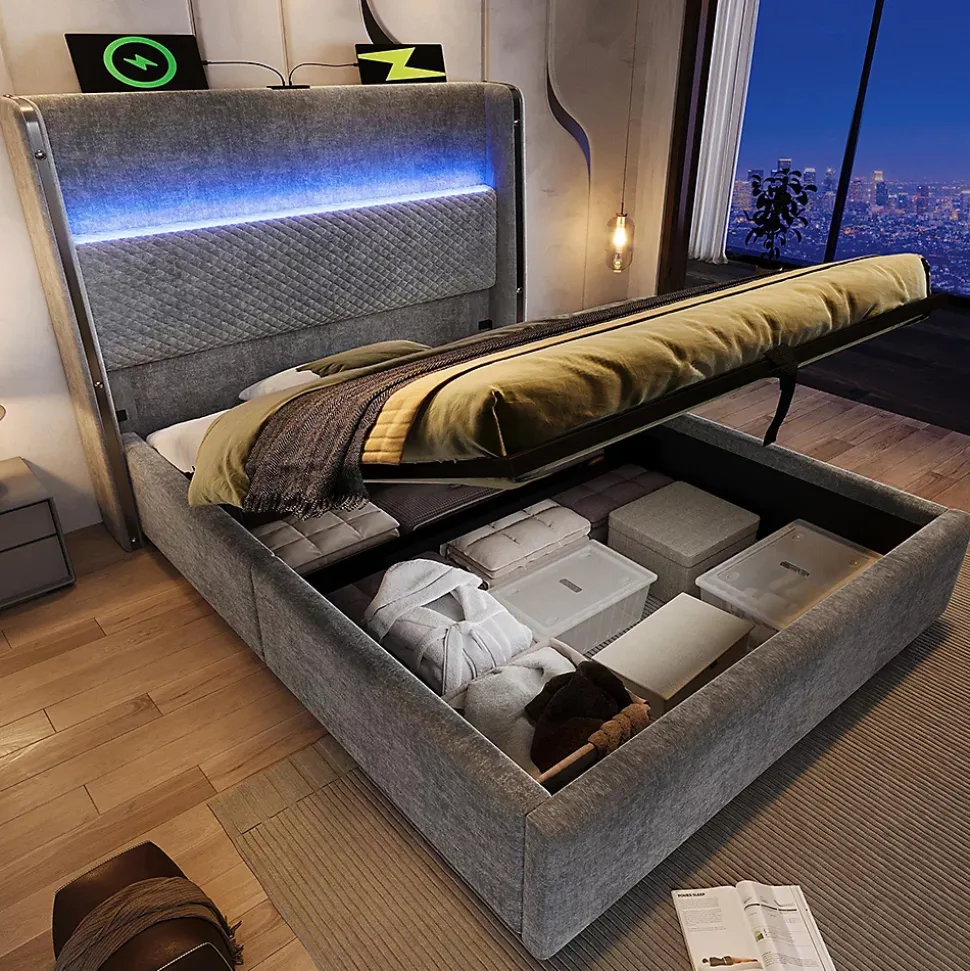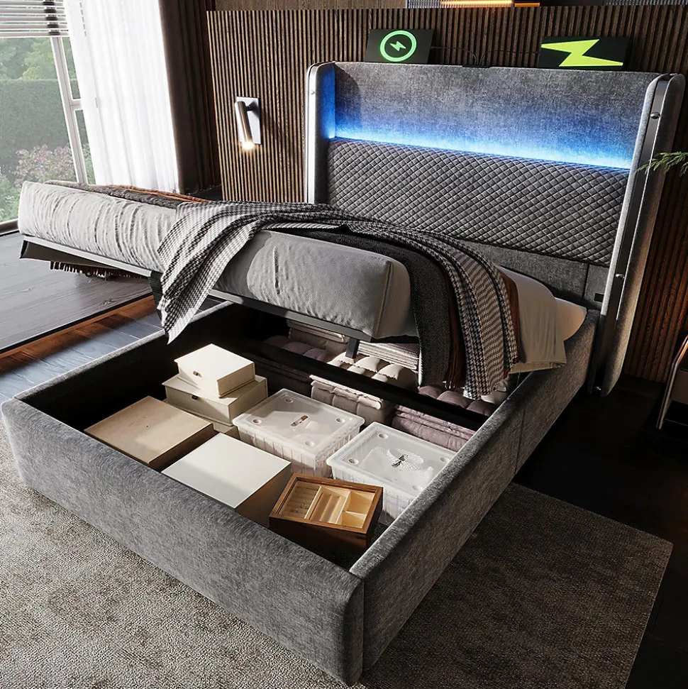 - 【Éclairage LED et ports de chargement】 Une bande lumineuse LED intégrée à la tête de lit, contrôlable à l’aide de boutons, d’une application ou d’une télécommande, offre plus de 60 000 options de couleurs, une minuterie et plusieurs modes d’éclairage dynamiques, créant ainsi une atmosphère romantique. Une station de recharge pratique située sur la tête de lit offre des options de recharge USB et Type-C pour les smartphones, tablettes et autres appareils, garantissant ainsi une expérience utilisateur plus intelligente et plus confortable.