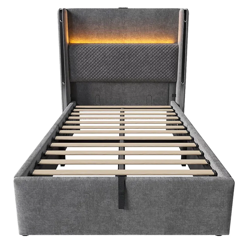 Caractéristiques du produitDimensions de l’emballageSous-article 1 : 109,5 * 31,5 * 25,48 cm 18,9 kgSous-article 2 : 161,49 * 38 * 22,99 cm 25,8 kgDescriptionsDimensions totales 221 x 103 x 121 cm (L x l x H)Matériau du plateau Lin + bois + métalCouleur GrisMatelas compatible (matelas non inclus) 90 x 200 cmÉpaisseur recommandée du matelas 20-25 cmPoids maximal de l’utilisateur 113 kg / 250 lbSommier à ressorts nécessaire NonAssemblage nécessaire OuiContenu du colis Cadre de lit + LED + station de rechargeNombre de colis 2Poids brut/poids net 44,7 kg/39,3 kgConception unique Lit hydraulique avec tête de lit hauteType de charge USB + Type C