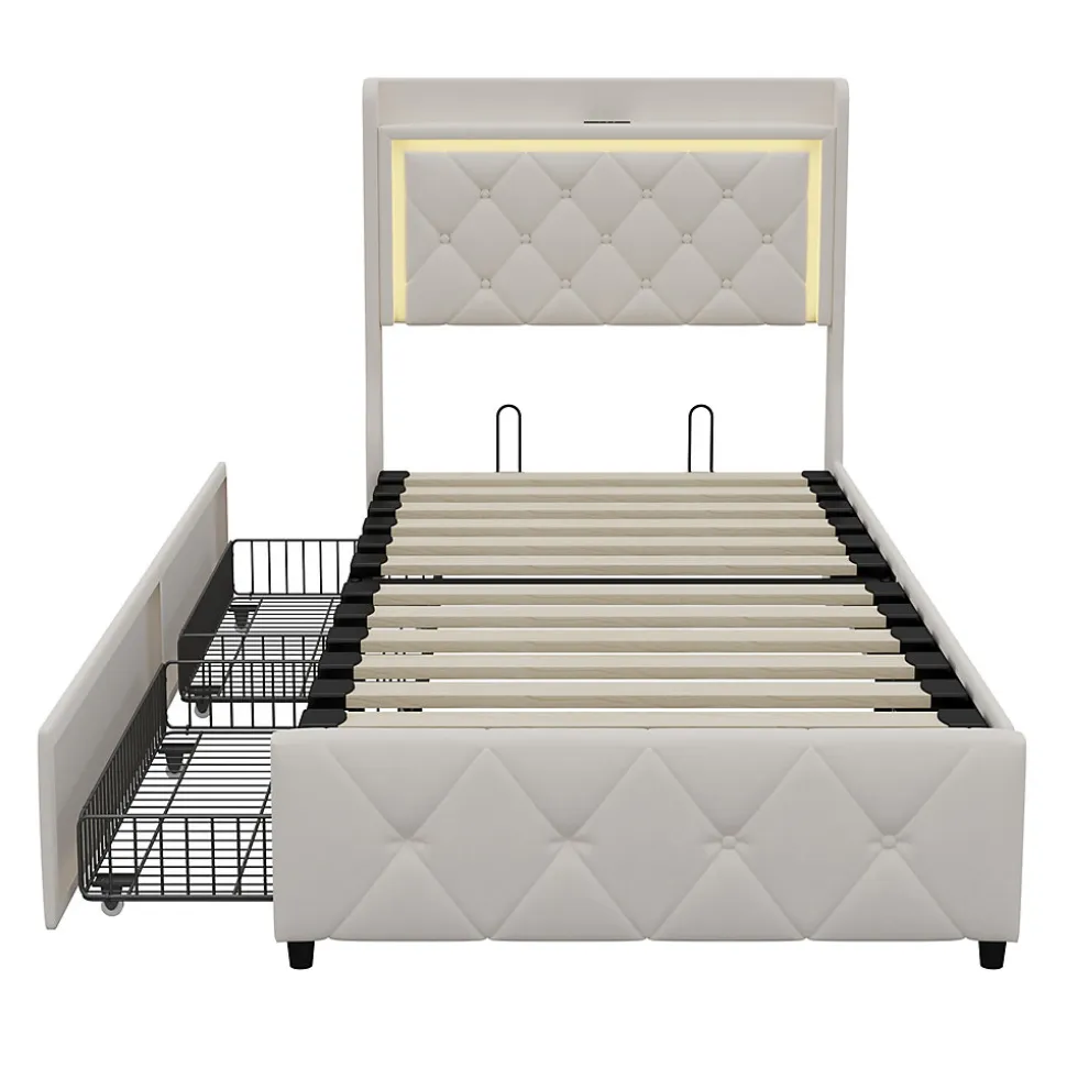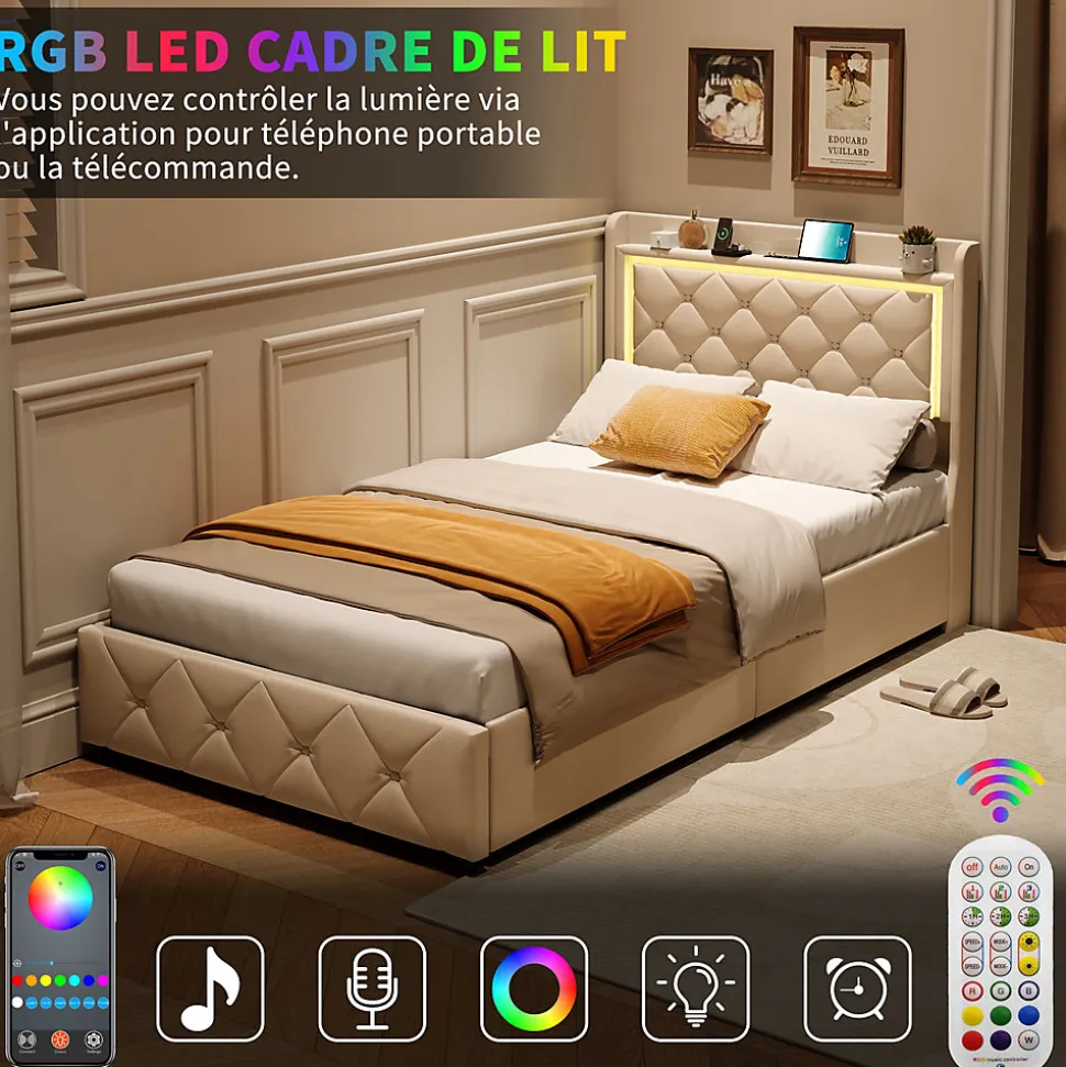 Tissu velours doux et élégant : Revêtement en velours beige de haute qualité, agréable au toucher et confortable pour un sommeil de qualité. Rangement tête de lit et lit à gaz : Compartiments pratiques dans la tête de lit et lit à gaz pour ranger linge de lit, vêtements ou accessoires. Éclairage LED intégré : Lampes décoratives sur la tête de lit pour une ambiance chaleureuse et moderne dans la chambre. Port USB et Type-C pratique : Chargez facilement vos appareils électroniques sans encombrer la chambre avec des câbles supplémentaires. Construction robuste et durable : Structure solide et matériaux de qualité garantissant stabilité, confort et utilisation en toute sécurité au quotidien. Remarque : Taille applicable : 90 x 200 cm (hors matelas) Pour garantir la sécurité, les produits sont expédiés par lots et peuvent ne pas arriver le même jour. Veuillez patienter.