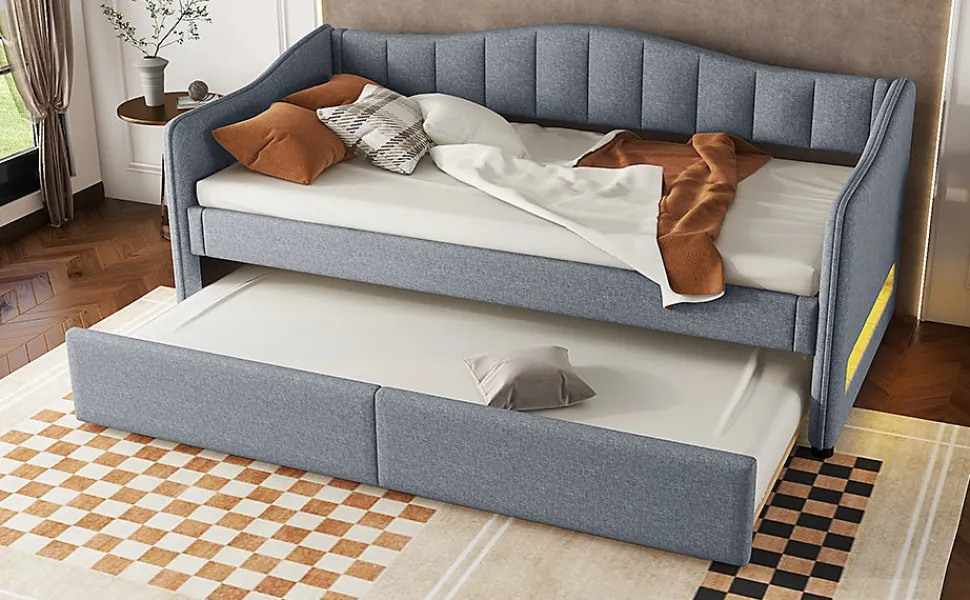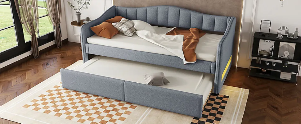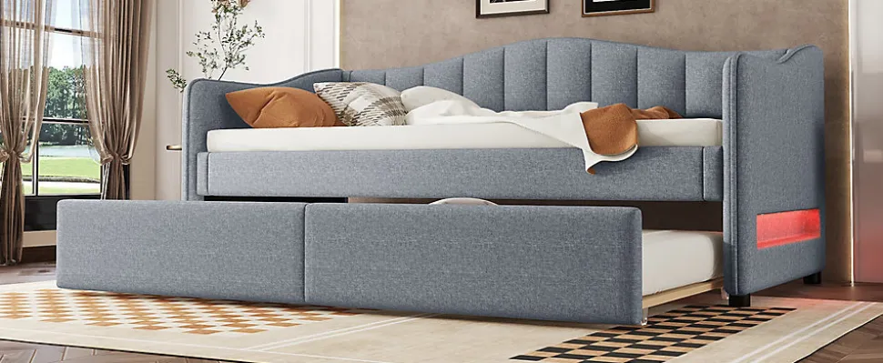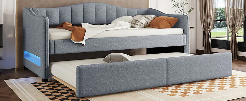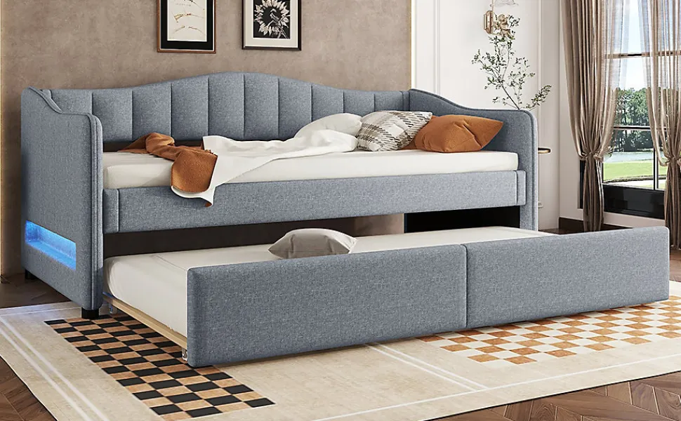 This minimalist sofa bed is made from premium linen and MDF, ensuring durability and comfort while offering a touch of quality. The unique design allows the bed to convert easily from a sofa to a bed, making it a versatile solution for small spaces. The headrest is equipped with LED ambient lighting, adding warmth and romance to your space. Choose this bed to enjoy restful sleep while showcasing your taste and style, transforming your bedroom.Features:Material: Linen + MDFDimensions: 212 x 99 x 85 cmWeight Capacity: 120 kgNumber of Slats: 18 pcsAssembly Required: YesOrigin: ChinaBenefits:High-Quality Materials: Made from durable linen and MDF for long-lasting comfort and a natural touch.Multifunctional Pull-Out Design: Easily convert from a sofa to a full-sized bed (90×200), ideal for small spaces.LED Ambient Light: The headrest features color-changing LED lights, creating a cozy, romantic atmosphere.Easy Assembly: All parts are clearly labeled, and the step-by-step guide ensures quick setup.Shipping: Ships in two packages from Germany, with potential delays in delivery.