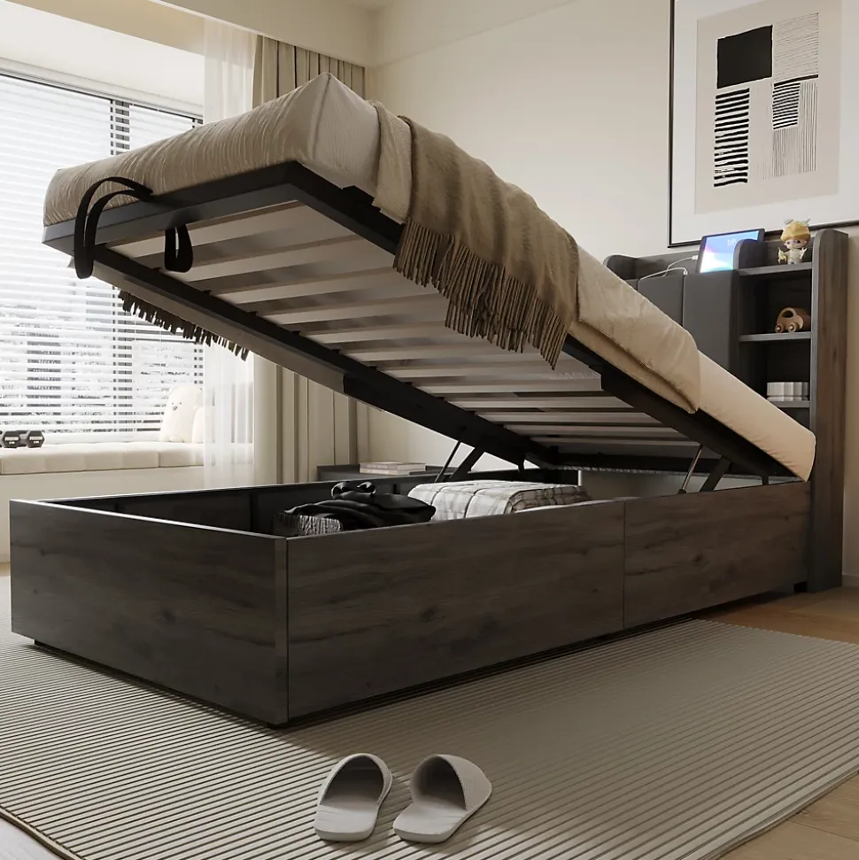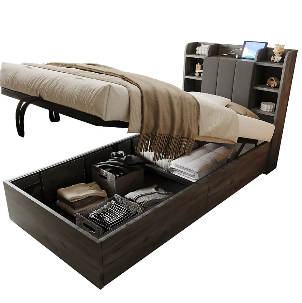 Fonction de rangement hydraulique : Ce lit simple dispose d’une structure hydraulique permettant d’optimiser l’espace. Sous le lit, vous pouvez ranger des vêtements, du linge de lit et d’autres objets. (Avant utilisation, il faut d’abord poser le matelas puis appuyer vers le bas.)Prise combinée USB et Type-C : Cette prise de charge pour lit hydraulique comprend 3 ports USB et 1 port Type-C, permettant de charger plusieurs appareils. (Avis de sécurité : utilisez de préférence 1 à 3 ports simultanément pour éviter toute surcharge électrique et tout accident.)Plusieurs compartiments : La tête de lit en bois comporte plusieurs petits compartiments pour ranger divers objets tels que réveil, jouets, tasses ou décorations, répondant à différents besoins.Grand espace de rangement caché : Derrière le dossier rembourré de la tête de lit se trouve un grand compartiment pour ranger de gros objets. Le dossier est bien rembourré pour un confort optimal lorsqu’on s’y appuie. Idéal pour les studios ou petits appartements.