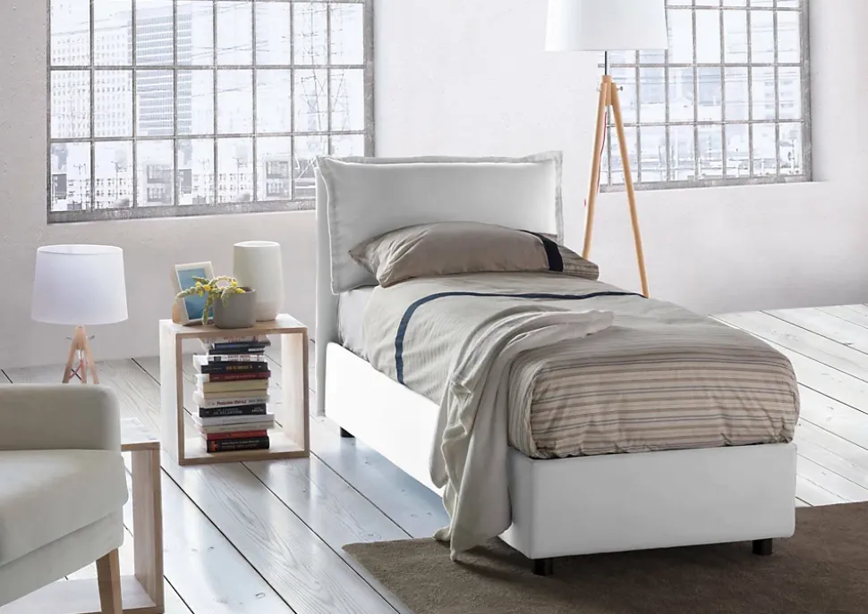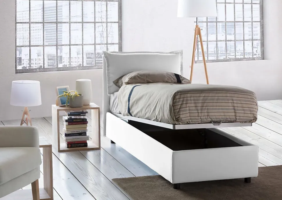 LIT SIMPLE – Lit coffre avec revêtement en tissu, 100% Made in Italy, Ouverture frontale, avec matelas 80×200 cm inclus, Blanc. STRUCTURE – La structure du lit est en fibre de bois surélevée du sol avec des pieds en ABS et est recouverte de tissu polyester déhoussable et lavable en machine à 30° – La tête de lit linéaire assortie en tissu avec coutures apparentes est solide et résistante – Le sommier à lattes en contreplaqué est inclus dans la structure – Mécanisme d’ouverture en fer – L’ajout du coffre pratique peu encombrant permet de transformer le lit en un coffre spacieux pour draps, oreillers et couettes. MADE IN ITALY – L’article est produit en Italie, avec l’utilisation des meilleurs matériaux et la plus haute qualité et attention aux détails – Le soin des processus de production est synonyme de fiabilité, de résistance et de raffinement – Made in Certification Italy est une garantie de pleine conformité avec la réglementation de l’Union européenne. MATELAS INCLUS – Matelas orthopédique amovible, anatomique et climatisé avec double support mesurant 80×200, hauteur 21 cm – Structure en polyuréthane expansé solide h 17 cm, densité 30EP recouverte d’une mousse viscoélastique à mémoire de forme h 2 cm, densité 55EP diamant- coupé dans la partie supérieure – Revêtement en tissu stretch 130 g, déhoussable et lavable en machine à 60° – Rembourrage 100% fibre polytechno, hypoallergénique et anti-acarien des deux côtés – Equipé d’une bande tri-space respirante avec zip et poignée en tissu – Article certifié OekoText. MESURES ET OUVERTURE – Dimensions du lit: Longueur 215 x Largeur 95 x Hauteur 95 cm (hauteur du sommier depuis le sol: 32cm) – Ouverture du conteneur: avant – Profondeur du conteneur: 20 cm environ – Hauteur des pieds: 10 cm environ – Fond de lit en mélamine d’une épaisseur de 1 cm – Dimensions matelas: 80×200 cm
