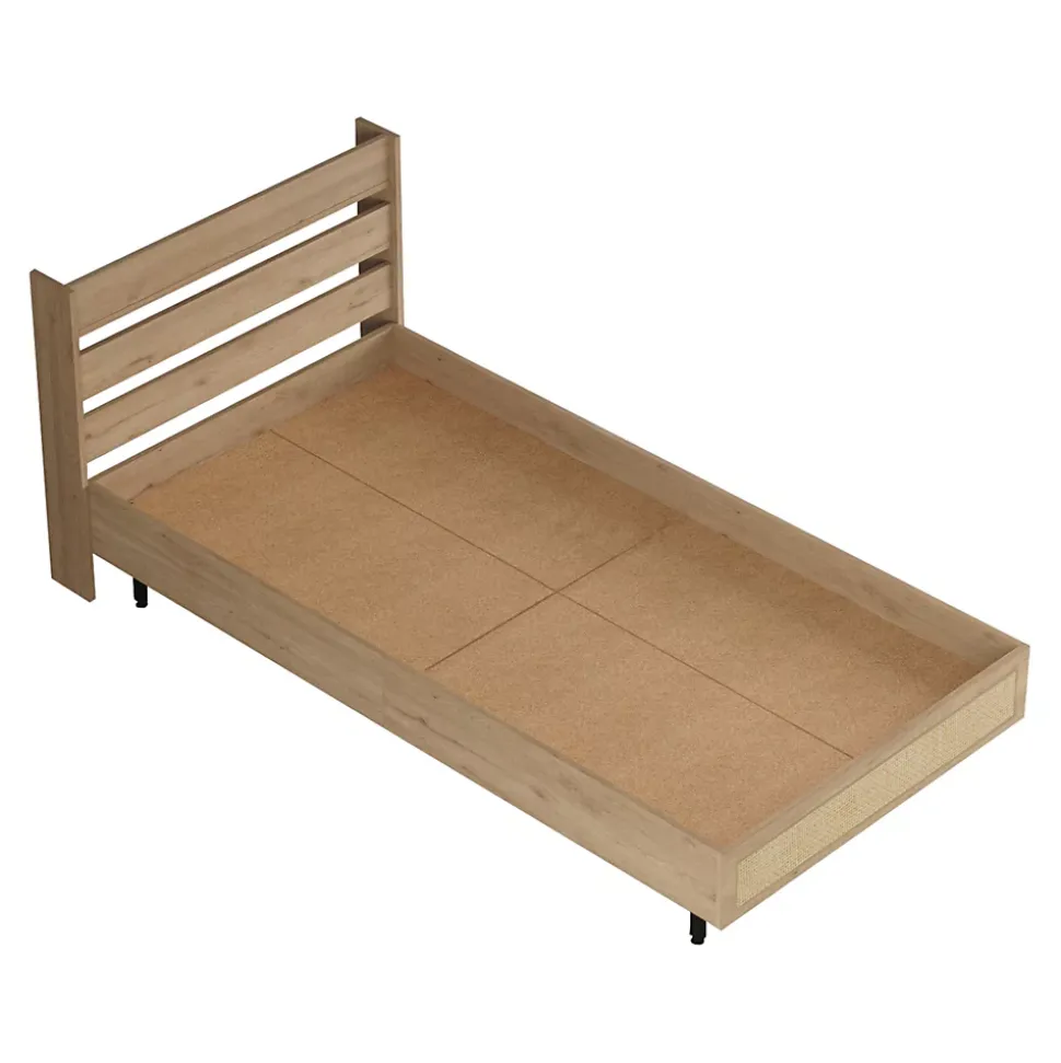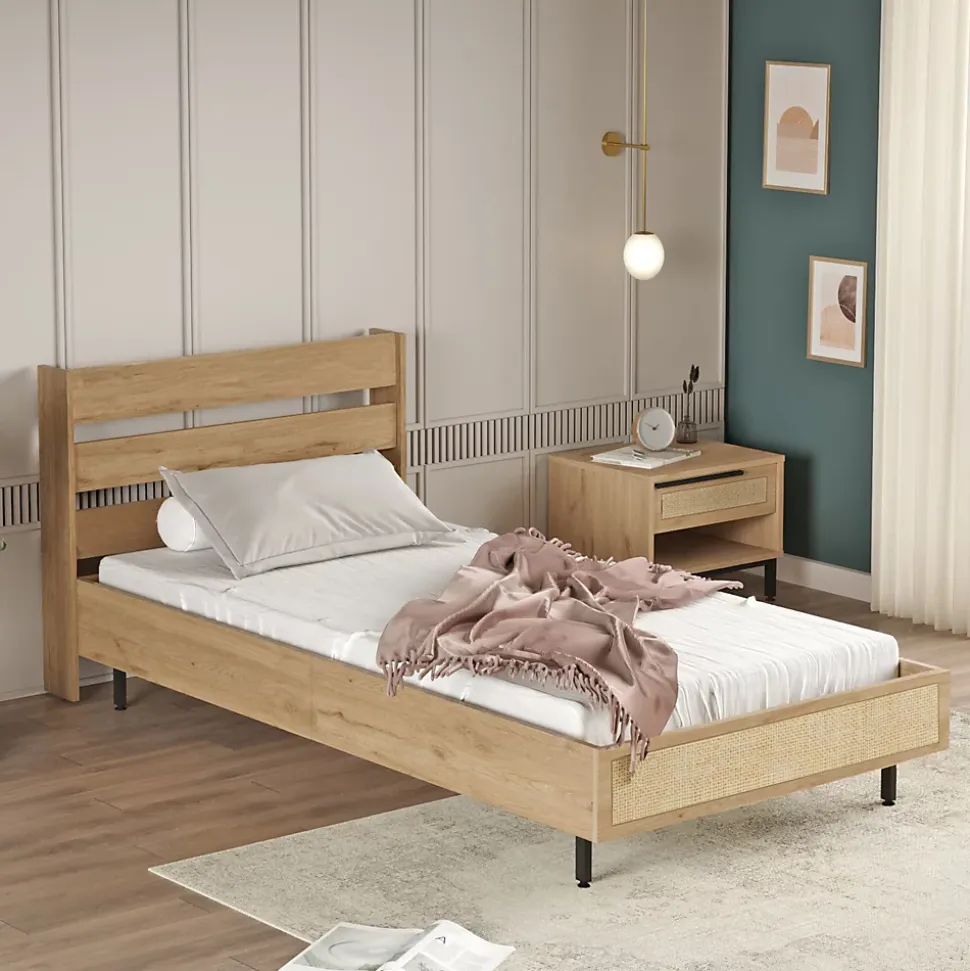 - Design Élégant et Polyvalent : Ce lit simple allie élégance et simplicité, avec un cadre en effet chêne et une façade de pied de lit en aspect rotin, s’intégrant parfaitement dans n’importe quel style de décoration, du moderne au classique.