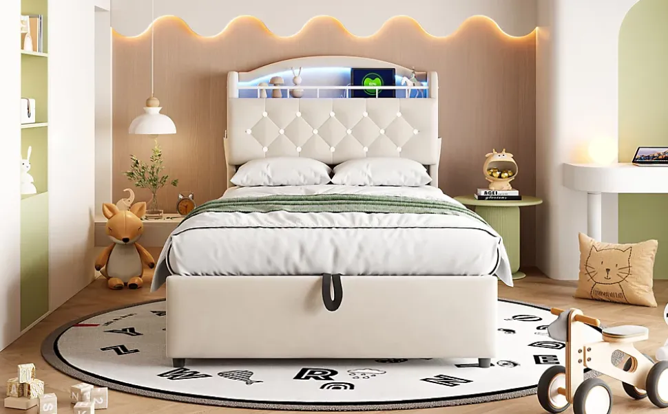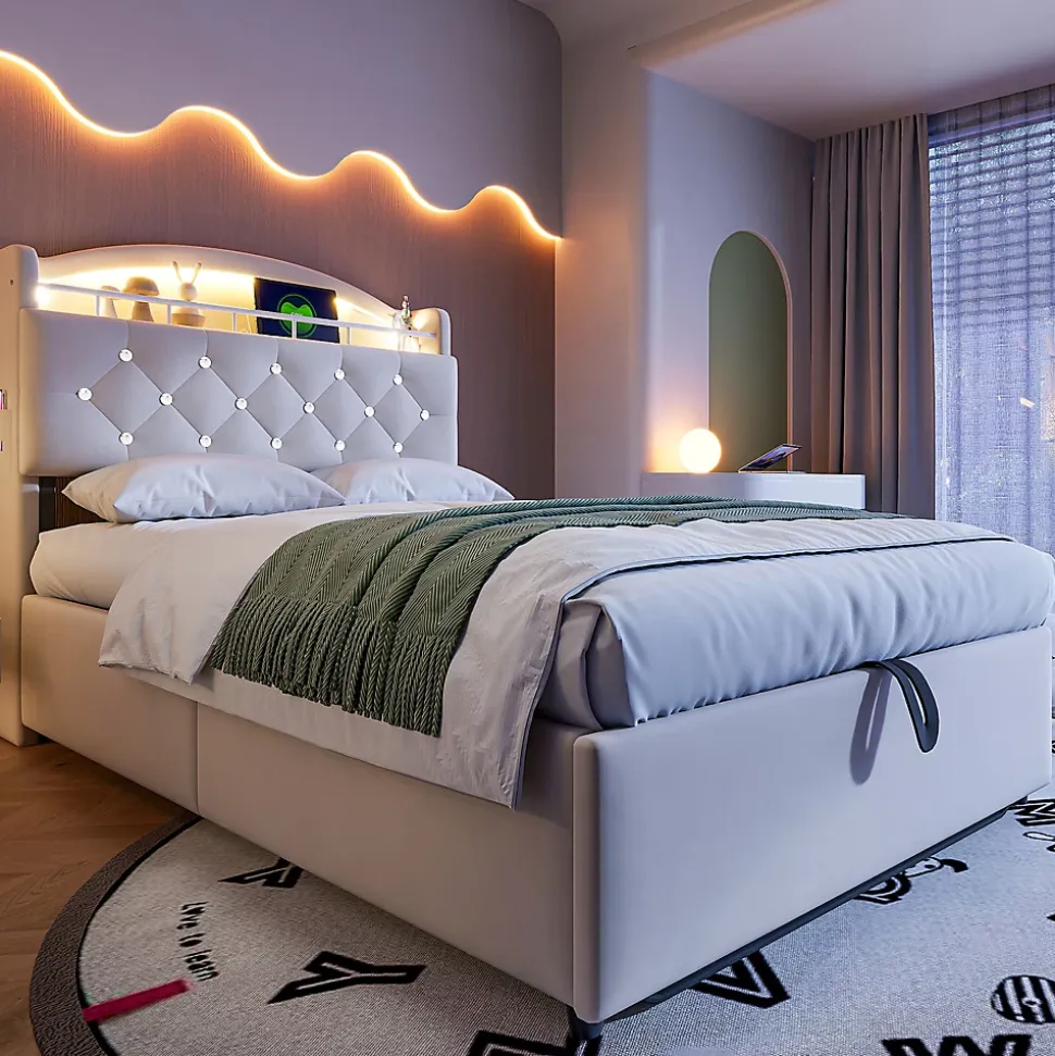 Lit coffre polyvalentGrand espace de rangement sous le lit avec un mécanisme hydraulique facile à utiliser pour garder la chambre bien ordonnée. Des rangements latéraux pratiques intégrés permettent de stocker de petits objets, alliant ainsi fonctionnalité et style.Design technologique et moderneLa tête de lit est ornée de losanges en plastique et équipée d’une bande LED multicolore créant une atmosphère amusante et dynamique. Dispose également de 3 ports USB et d’un port Type-C pour recharger vos appareils facilement depuis le lit.Structure robuste et stableLe design à larges pieds de chaque côté de la tête de lit améliore la stabilité et empêche tout balancement, assurant un sommeil sûr et confortable.Lattes métalliques solidesLes lattes en métal offrent une excellente stabilité et un soutien durable, garantissant une longue durée de vie. La capacité de charge atteint jusqu’à 200 kg.Tissu doux et élégantRevêtu d’un tissu en velours doux et agréable au toucher, disponible en beige, gris et rose, pour s’adapter harmonieusement à la décoration de votre chambre.