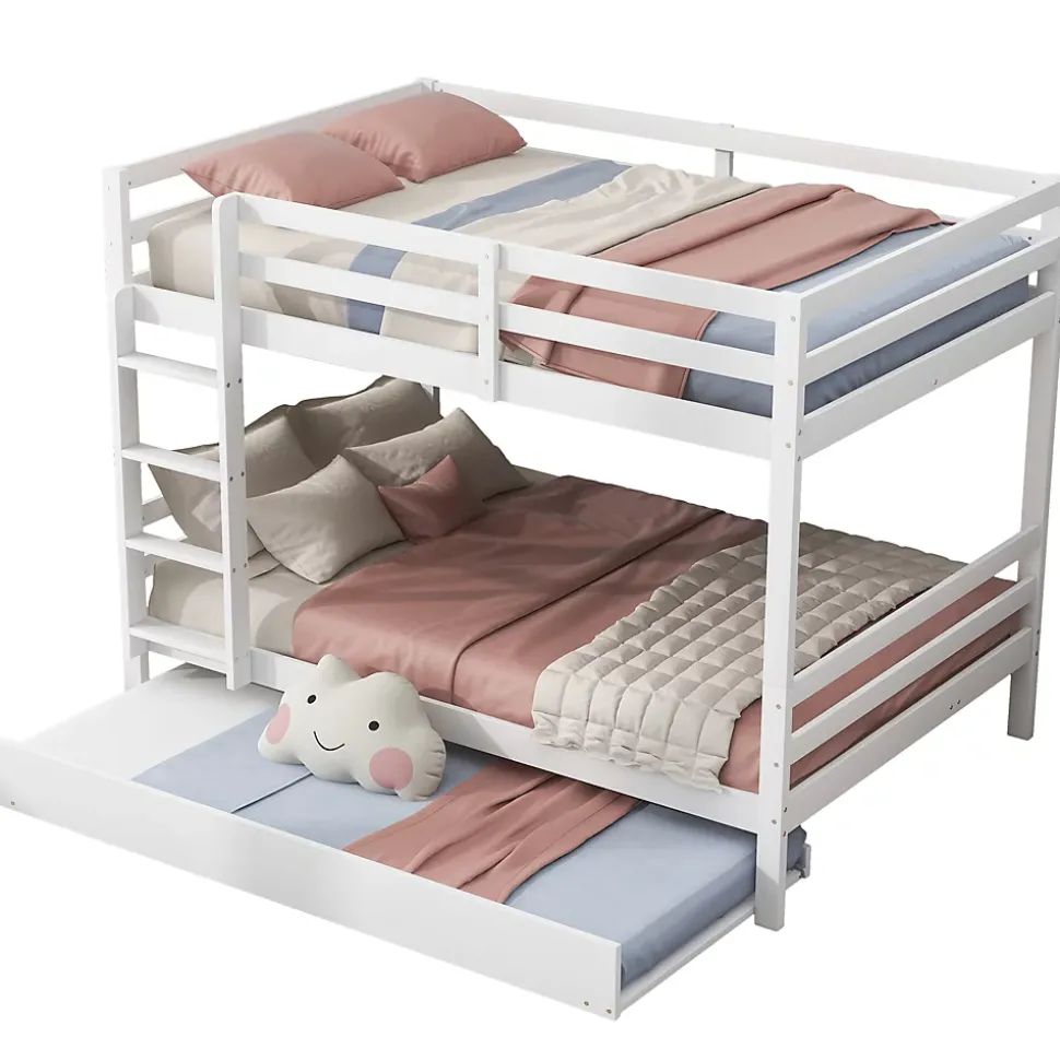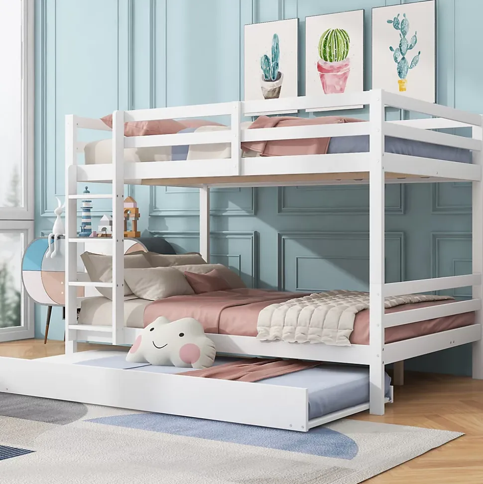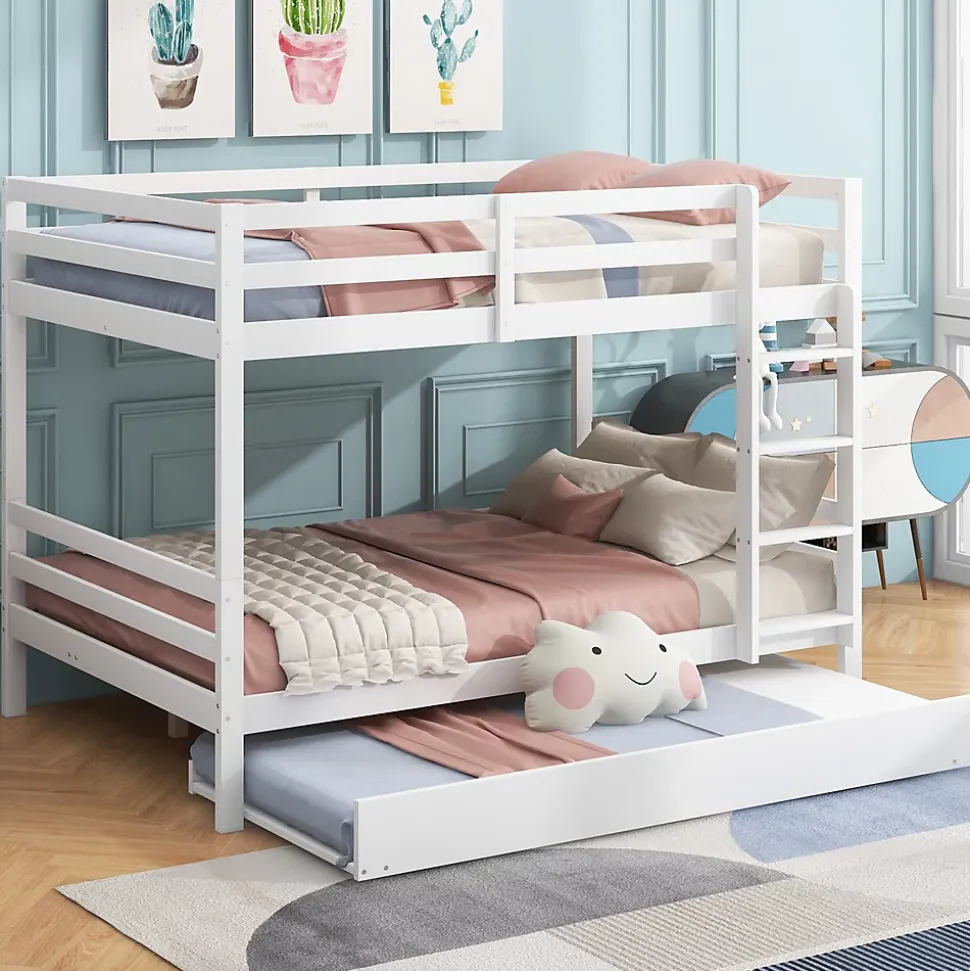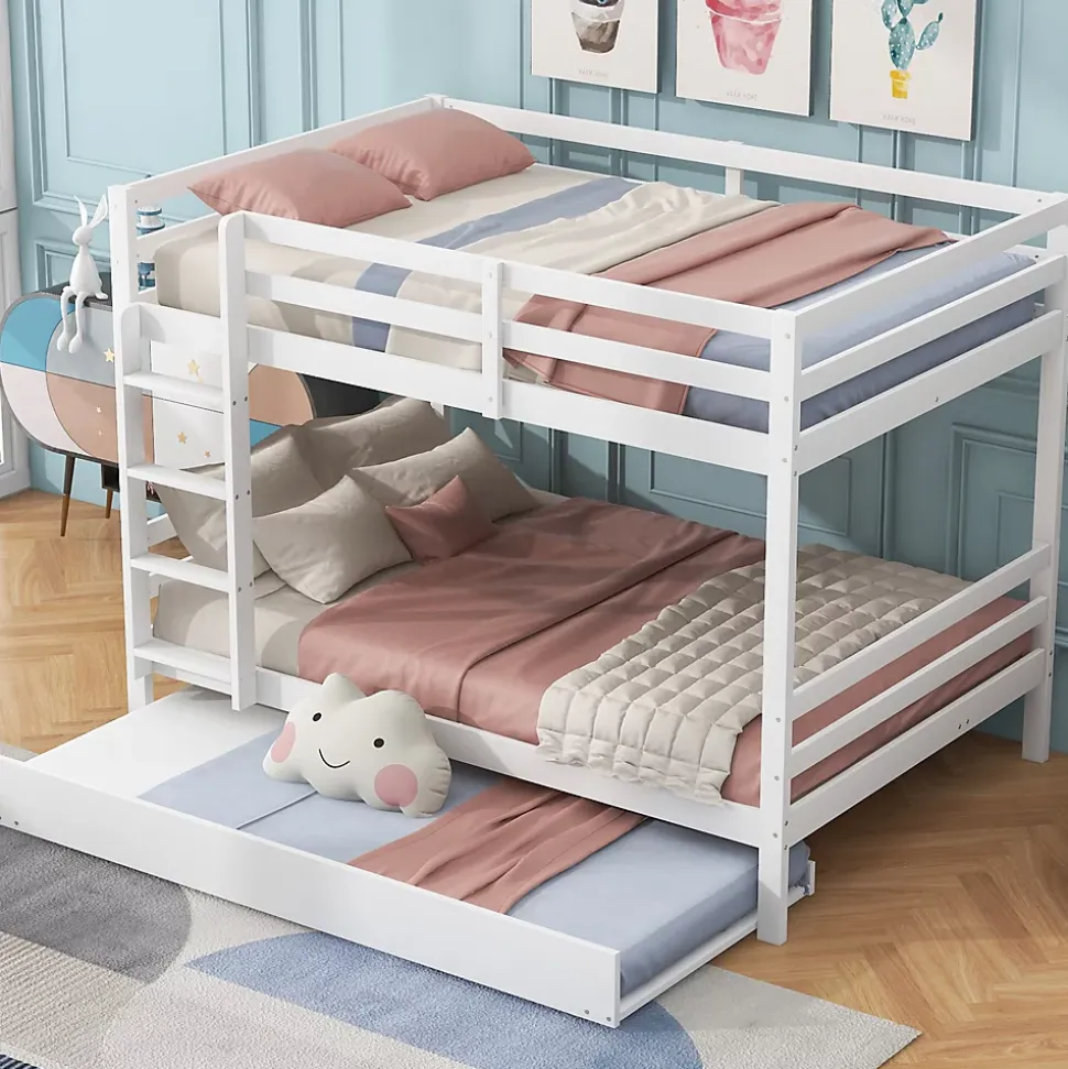 - Configuration pratique avec lit supérieur sécurisé par garde-corps hauts, échelle stable pour l’accès et lit gigogne dissimulé pour accueillir un invité ou un enfant supplémentaire, optimisation de l’espace.