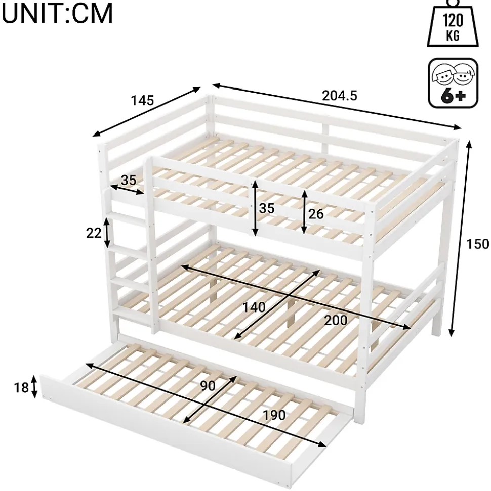 Design & styleCe lit superposé présente un style simple et contemporain en finition blanche, conçu pour s’intégrer facilement dans différents intérieurs. La combinaison pin massif et MDF offre une esthétique chaleureuse et sobre tout en restant fonctionnelle pour une chambre d’enfant ou d’ado.Fonctionnalités & couchage Lit supérieur sécurisé par des garde-corps hauts pour limiter les risques de chute. Lit inférieur avec lit gigogne escamotable, permettant d’accueillir un troisième couchage sans encombrer l’espace au quotidien. Échelle latérale stable pour un accès aisé au couchage supérieur et conception pensée pour un usage familial.Matériaux & entretienStructure en pin combinée à des panneaux MDF, assemblage robuste pour une bonne durabilité. Sommiers à lattes intégrés (nombre de lattes variable selon position) et surfaces faciles à entretenir avec un chiffon doux et un détergent neutre si nécessaire.Dimensions & installationDimension totale produit : 204,5x145x150 cm. Surface de couchage principale : 140×200 cm. Épaisseur recommandée de matelas : 10–15 cm pour les lits principaux, 5–10 cm pour le lit gigogne. Capacité de charge indiquée : environ 120 kg par couche. Produit fabriqué en Chine et livré en 3 colis depuis l’Allemagne ; les colis peuvent arriver à des moments différents. Montage requis, deux personnes conseillées.