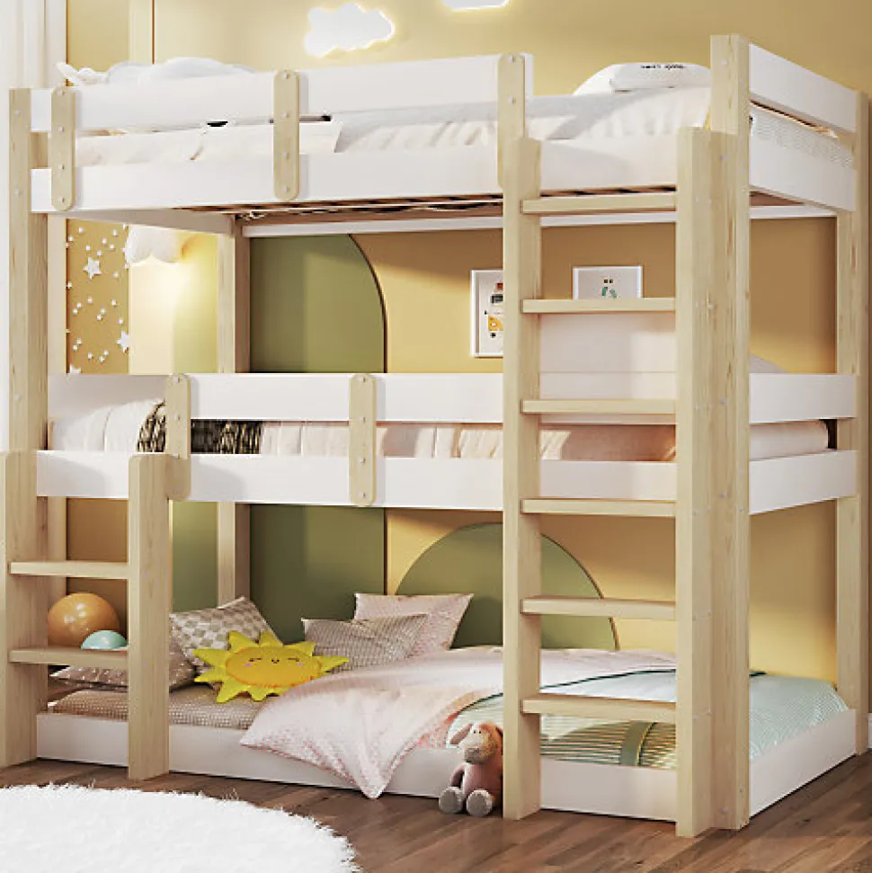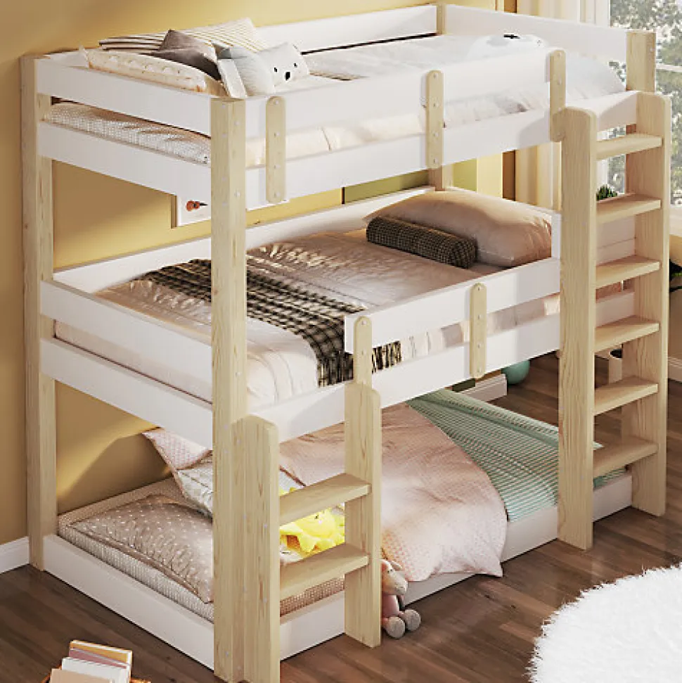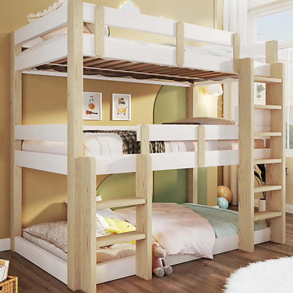 •【Cadre en bois massif de qualité supérieure】Fabriqué en bois massif de qualité supérieure et en panneaux de fibres de moyenne densité (MDF), ce lit superposé est robuste et durable, offrant une grande capacité de charge et contribuant à la croissance saine des enfants.•【Barrières de sécurité surélevées】Chaque lit superposé est équipé de barrières de sécurité surélevées. L’espacement étudié empêche efficacement les enfants de tomber lorsqu’ils dorment ou jouent.•【Style minimaliste】Grâce à son design minimaliste, ce lit superposé triple s’intègre harmonieusement à différents styles d’intérieur. Il convient aux résidences étudiantes, aux appartements et aux chambres d’enfants.•【Double échelle pour plus de sécurité et de praticité】Les échelles antidérapantes de chaque côté facilitent l’entrée et la sortie du lit, s’adaptant ainsi à différentes configurations de pièces et répondant aux besoins des enfants de différentes capacités.•【Trois couchages】Ce lit superposé peut accueillir confortablement trois personnes, ce qui en fait un choix idéal pour les familles nombreuses ou pour celles qui reçoivent régulièrement des proches. L’utilisation optimale de l’espace vertical permet d’aménager les petites chambres.•【Facile à assembler】Des instructions détaillées et des pièces complètes sont disponibles pour vous aider à réaliser l’assemblage rapidement.