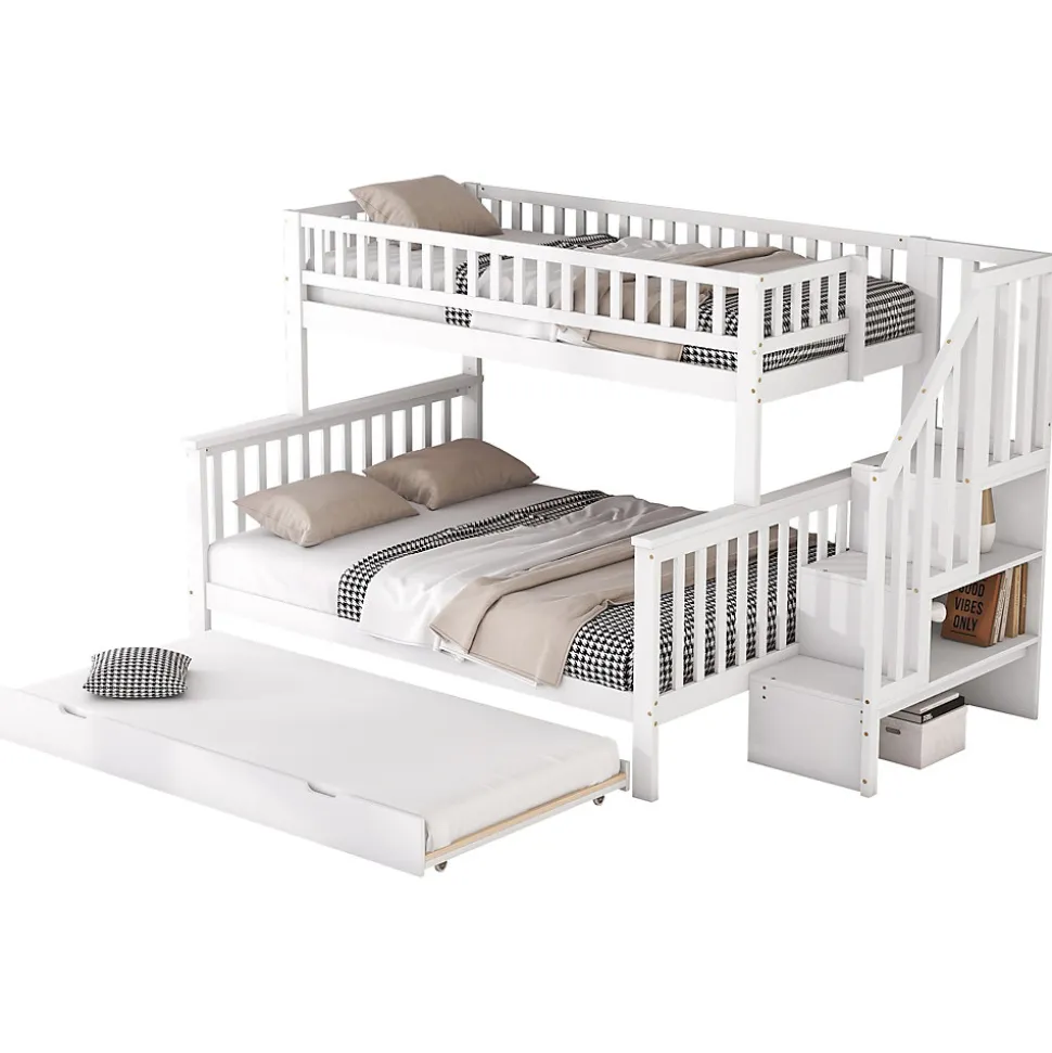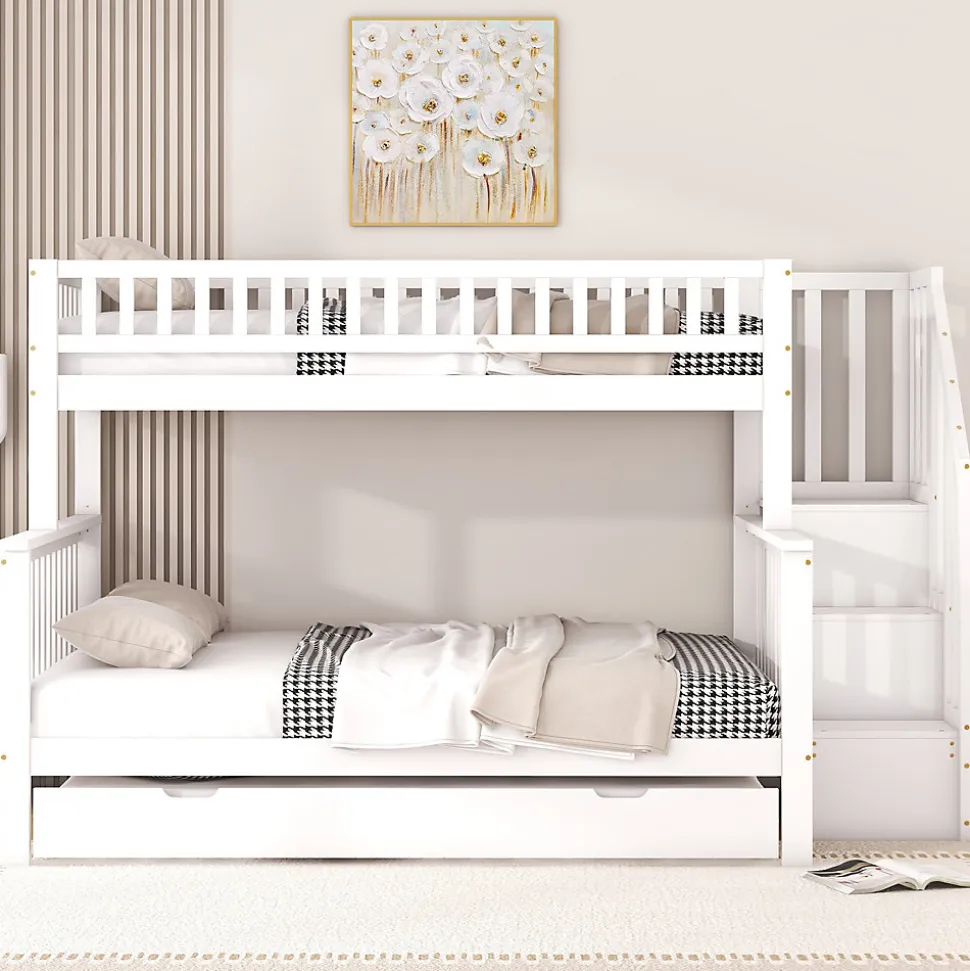 Design & styleCe lit superposé présente un design sobre et fonctionnel en blanc, conçu pour s’intégrer discrètement dans une chambre enfant ou ado. Les lignes épurées et la finition blanche conviennent à divers styles d’aménagement tout en offrant une apparence lumineuse.Fonctionnalités & rangement Deux couchages distincts 90×200 cm (partie haute) et 140×200 cm (partie basse) pour une organisation flexible de la chambre. Échelle intégrée avec espaces de rangement et plusieurs niches en bout de lit pour garder les essentiels à portée de main. Lit gigogne coulissant 90×190 cm inclus, utilisable pour les nuits d’invités et se range sans encombrer la pièce.Dimensions & couchagesDimensions totales approximatives du meuble : 253x240x160 cm. Intérieur couchage : 90×200 cm (haut) et 140×200 cm (bas). Lit gigogne intérieur : 90×190 cm. Capacité de charge : 120 kg par niveau principal, 80 kg pour le lit gigogne. Nombre de lattes : 15 pièces. Épaisseur de matelas recommandée : 10–15 cm pour le lit supérieur, 15–20 cm pour le lit inférieur, 10 cm pour le gigogne.Matériaux & entretienStructure en pin massif complétée par éléments en MDF pour une stabilité renforcée. Finition blanche facile à entretenir : nettoyer avec un chiffon doux et un détergent neutre si nécessaire. Éviter les produits abrasifs pour préserver la surface.Installation & livraisonProduit livré en 4 colis depuis l’entrepôt ; les colis peuvent arriver à des dates différentes. Montage requis, deux personnes recommandées. Mesures fournies à titre indicatif, tolérance de 2–3 cm. Pour toute question d’installation, contacter le service client.