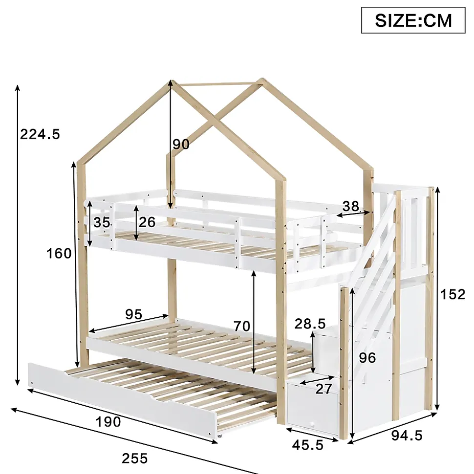 ▶ ▶ Détails ▶────────────────● Type de produit : Lit superposé● Dimensions totales : 255 × 94,5 × 224,5 cm● Poids total : 94 kg● Matelas compatibles : Haut et bas : 90 × 200 cm ; Lit tiroir : 90 × 190 cm (Épaisseur ≤ 13 cm, Sans Matelas)● Capacité maximale : 120 kg● Couleur : Nature + Blanc● Matériau du cadre : Bois + MDF● Matériau des lattes : Bois● Montage : À assembler soi-même● Nombre de colis : 4► Remarques ►※ Ce produit sera livré en 4 colis. Ils peuvent ne pas arriver en même temps. Veuillez patienter.※ En raison de mesures manuelles, une différence de 2–3 cm peut survenir.※ Des différences de couleur peuvent apparaître entre les images et le produit réel en raison de l’éclairage. Veuillez vous référer au produit reçu.※ Si vous avez des questions lors de l’installation, veuillez nous contacter dès que possible.