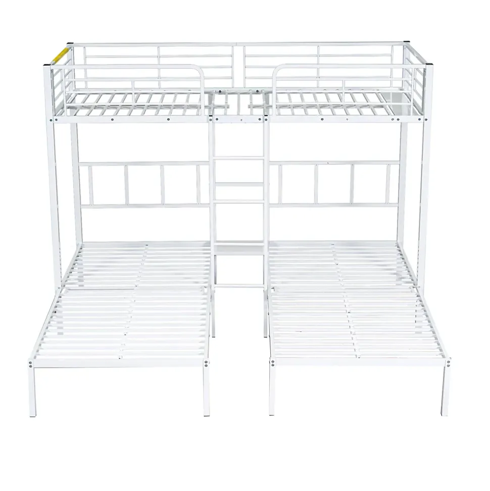 Description:Ce lit triple est la solution idéale pour les familles nombreuses ou les chambres d’enfants partagées, optimisant l’espace tout en offrant une solution de couchage confortable et pratique. Il est conçu pour accueillir trois matelas de 90×200 cm, et grâce à sa conception superposée, il permet d’offrir un grand espace de couchage tout en minimisant l’encombrement. Ce lit est accompagné d’une solide échelle, permettant aux enfants de monter et descendre en toute sécurité. Le cadre en métal assure une structure robuste et stable, tandis que les panneaux métalliques sont également très durables, garantissant une longue durée de vie au lit.Le lit est équipé d’un espace de rangement sous le cadre supérieur, idéal pour stocker des livres, des jouets ou d’autres objets. Ce lit triple est une option parfaite pour maximiser l’espace et répondre aux besoins de couchage de plusieurs enfants dans une seule pièce. Avec un design pratique et une construction stable, ce lit est une excellente option pour toute chambre d’enfant ou d’adolescent.Caractéristiques :Lit superposé triple avec échelle pour une utilisation optimale de l’espaceStructure en métal robuste pour plus de stabilité et de sécuritéÉchelle droite à quatre marches pour un accès facileEspace de rangement sous le lit supérieur pour plus de commoditésLit idéal pour les grandes familles ou les chambres partagéesDesign simple et moderne, facile à assemblerDimensions : 227 x 205,5 x 170 cmPoids total : 60 kgDimensions des matelas recommandés : 90×200 cm (épaisseur du matelas ≤ 13 cm)Poids maximum supporté : 100 kg