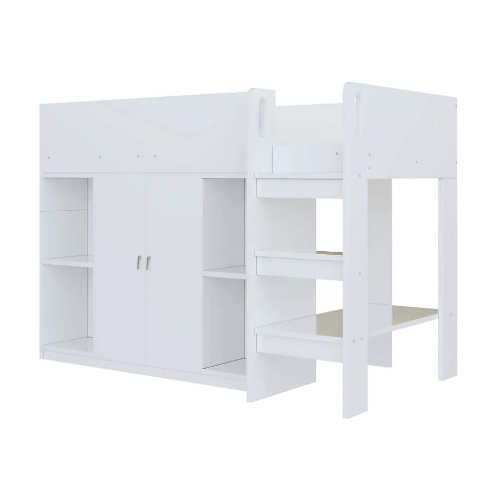 - Design moderne et épuré en blanc et gris, réalisé en bois massif pour une silhouette sobre qui s’intègre facilement dans une chambre d’enfant ou d’ado tout en optimisant l’espace disponible.