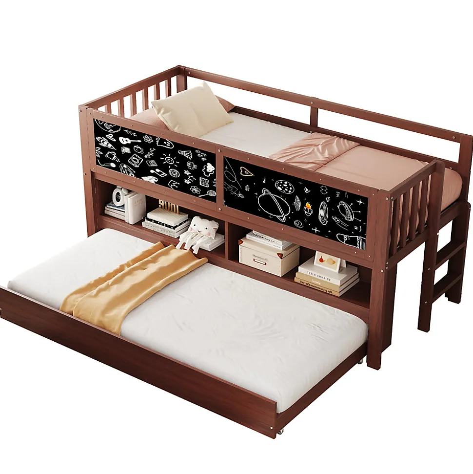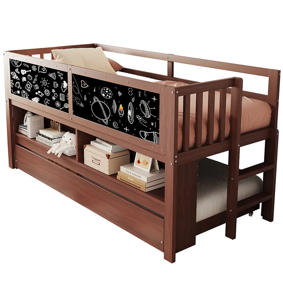- Design fonctionnel et ludique intégrant des panneaux tableau à craie sur les côtés, finition bois brun et lignes équilibrées pour s’harmoniser dans une chambre enfant tout en restant sobre.