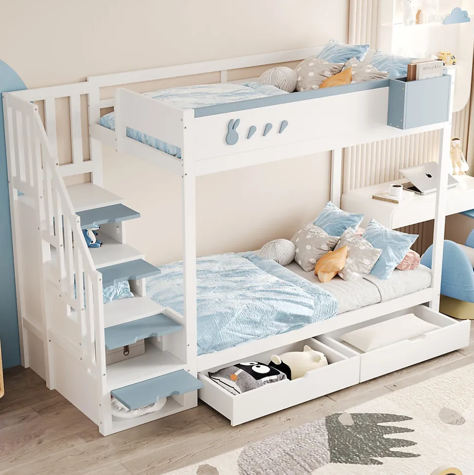 Design & styleCe lit superposé 90×200 cm joue la carte du charme enfantin avec un garde-corps orné de motifs lapin et carotte et un contraste blanc/bleu qui anime la pièce sans l’alourdir. Ses lignes sont équilibrées pour s’intégrer dans une chambre enfant ou ado tout en offrant une esthétique ludique et soignée.Fonctionnalités & rangement Étagère amovible intégrée au lit supérieur pour livres, jouets ou objets décoratifs, facilement détachable selon les besoins. Deux grands tiroirs sous le lit et une échelle avec porte de rangement optimisent l’espace et permettent d’organiser vêtements, linge de lit ou jouets. Barrières de sécurité continues et sommiers à lattes sur les deux couchages pour un maintien régulier des matelas.Matériaux & entretienStructure en bois (pin), contreplaqué et MDF offrant solidité et durabilité pour un usage quotidien. Finition blanc/bleu (ou blanc/rose selon modèle). Surfaces faciles à nettoyer avec un chiffon doux et un produit non abrasif.Dimensions & capacitésDimensions totales : 252,5 x 95 x 167 cm. Couchage : 90×200 cm. Nombre de lattes : 30. Poids produit : 104 kg ; poids total colis : 114 kg. Capacité de charge : 120 kg par lit. Épaisseur matelas recommandée : 8–12 cm.Installation & emballageMontage complet requis, temps estimé env. 2 heures avec deux personnes. Produit livré en 5 colis pouvant arriver séparément. Outils fournis ; évitez l’usage d’outils électriques pour préserver les pièces. Notice incluse pour un montage sécurisé.