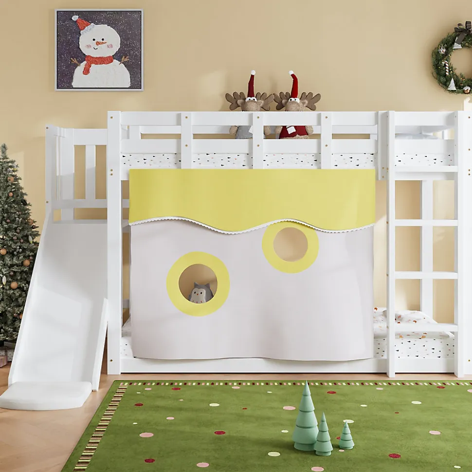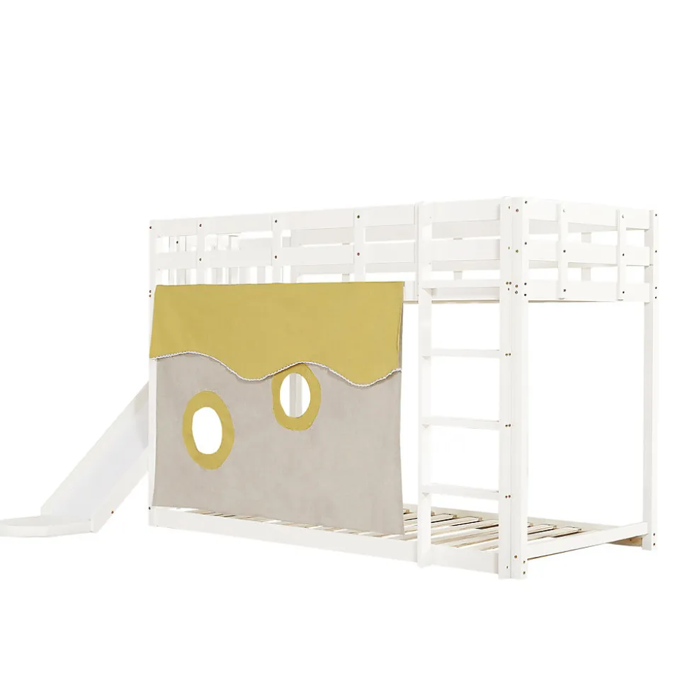 Design & usageCe lit superposé 90×200 cm combine une silhouette ludique et une finition blanche neutre pour s’adapter à divers styles de chambre enfant ou ado. Le toboggan transforme l’accès en activité récréative tandis que les rideaux inclus créent un espace intime et cocooning pour l’enfant.Fonctionnalités & sécuritéÉchelle intégrée et toboggan pour une montée et descente ludiques.Garde-corps et barrières latérales sur le lit supérieur pour réduire les risques de chute.Rideaux fournis pour plus d’intimité et zones de jeu sous le lit supérieur.Matériaux & dimensionsStructure en MDF et pin avec éléments en contreplaqué pour les lattes. Dimensions totales : 244,5x165x140,5 cm. Couchage : 90×200 cm (épaisseur matelas recommandée ≤10 cm). Poids total approximatif : 52,5 kg. Charge admissible : 180 kg.Installation & entretienProduit livré en deux colis ; montage requis avec la notice fournie, deux personnes recommandées. La structure n’est pas réversible gauche-droite. Surfaces faciles à entretenir : nettoyer avec un chiffon doux et humide, ne pas utiliser d’agents corrosifs.Emballage & informations complémentairesLivré en 2 colis pouvant arriver séparément. Matelas non inclus. Origine : Chine. Conçu pour optimiser l’espace et proposer un coin sommeil et jeu sécurisé dans la chambre d’enfant.
