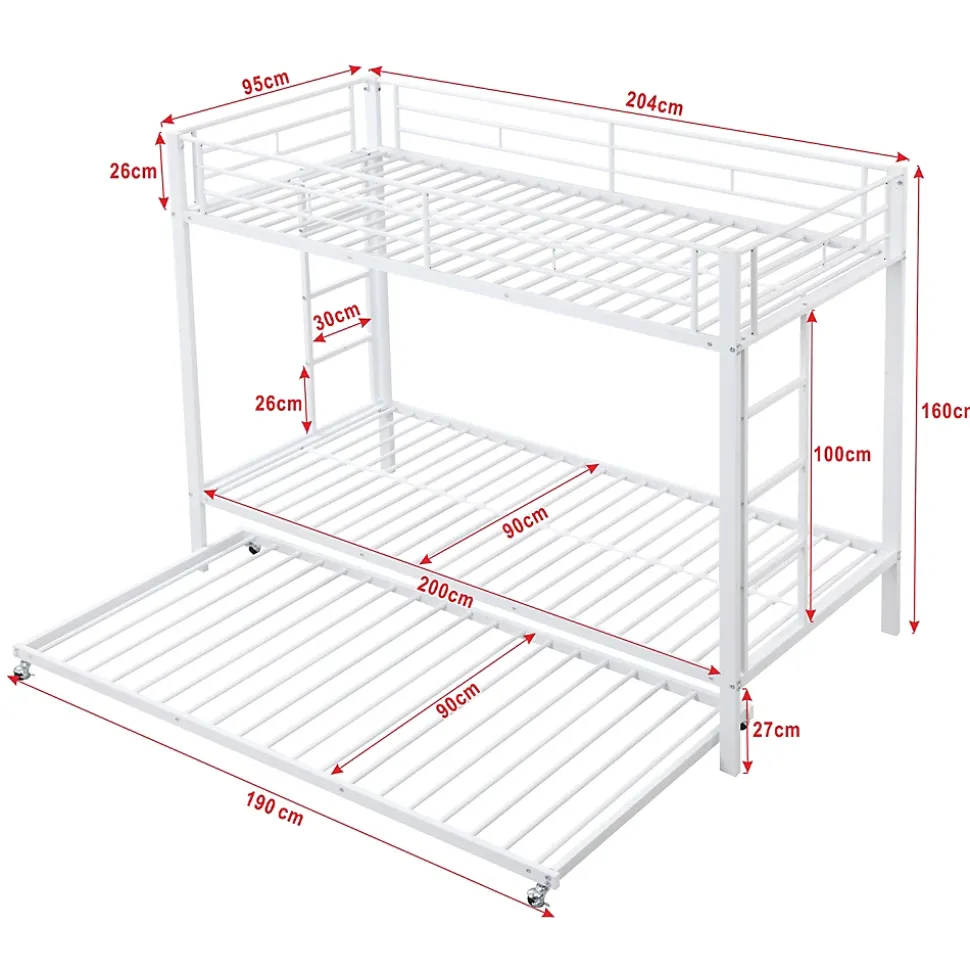 DescriptionLit superposé 90 x 200 cm pour enfant, cadre en métal noir, équipé d’un lit gigogne, certifié EN747. Ce lit combine robustesse, design moderne et fonctionnalités pratiques pour maximiser l’espace et offrir un environnement de sommeil sûr et confortable. Le lit supérieur dispose d’un garde-corps conforme aux normes EN747 pour la sécurité des enfants. Le lit gigogne intégré permet d’accueillir un couchage supplémentaire de manière flexible et pratique. Idéal pour les chambres modernes, ce lit apporte confort et style à la maison.Caractéristiques du produit :Robuste et durable : Cadre en métal solide, résistant à la déformation et aux usages quotidiens, supportant des poids plus lourds pour une longue durée de vie.Lit gigogne intégré : Offre un couchage supplémentaire, facilement adaptable selon vos besoins.Garde-corps haute sécurité : Conforme EN747, protège l’enfant et assure un sommeil sûr.Style moderne : Design minimaliste noir, élégant et fonctionnel, s’adapte à tout intérieur contemporain.Livraison pratique : Expédié depuis l’Allemagne en 2 colis, pouvant arriver séparément ; patience ou contact avec le service client recommandé.Descriptif et dimensions :Matériau : métalCouleur : noirDimensions totales : 204 x 95 x 160 cmLit supérieur : 90 x 200 cm, capacité 120 kgLit gigogne : 90 x 190 cm, capacité 80 kgHauteur totale : 160 cmNombre de sommiers à lattes : 24Épaisseur de matelas recommandée : 15-20 cm (Matelas non inclus)Nombre de colis : 2Assemblage requis : oui