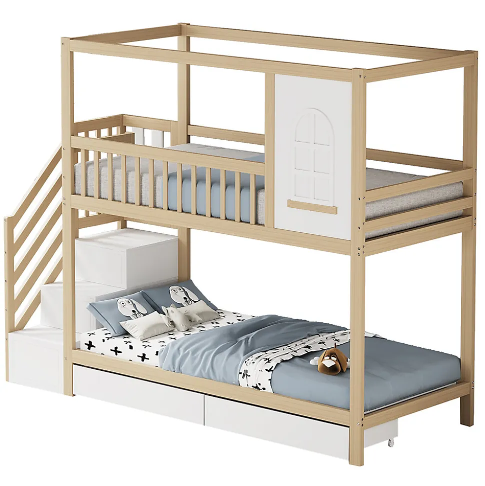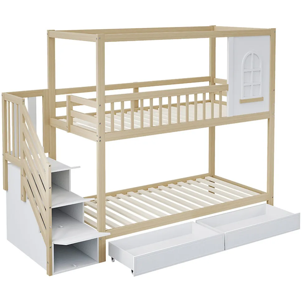 Design & styleCe lit superposé présente un look maison original avec un élément fenêtre et des patères sous la fenêtre pour suspendre décorations ou accessoires. Couleurs bois naturel et blanc pour une intégration sobre et chaleureuse dans la chambre d’un enfant ou d’un adolescent. Les lignes jouent sur l’esthétique tout en restant fonctionnelles.Fonctionnalités & rangement Deux grands tiroirs sous le lit pour le linge de lit ou les vêtements, accessibles facilement. Échelle latérale sécurisée dont chaque marche intègre un tiroir dissimulé pour jouets, livres ou petits objets. Garde-corps sur le lit supérieur pour la sécurité et sommiers à lattes inclus (30 lamelles) pour un support stable du matelas.Matériaux & sécuritéAssemblage de pin massif, contreplaqué et panneaux MDF pour une construction robuste et durable. Chaque couchage supporte une charge allant jusqu’à 120 kg. Épaisseur de matelas recommandée : 8-12 cm. Le design intègre des garde-corps et des accès sécurisés pour limiter les risques lors de l’utilisation.Installation & emballageMontage complet requis, deux personnes recommandées ; outillage de base fourni, tournevis nécessaire. Livré en 3 colis (poids total paquet env. 85 kg, produit 79 kg). Dimensions totales : 252 x 96 x 192 cm. Temps d’assemblage estimé : environ 2 heures. Ne pas utiliser d’outils électriques puissants lors du montage pour préserver les éléments bois.