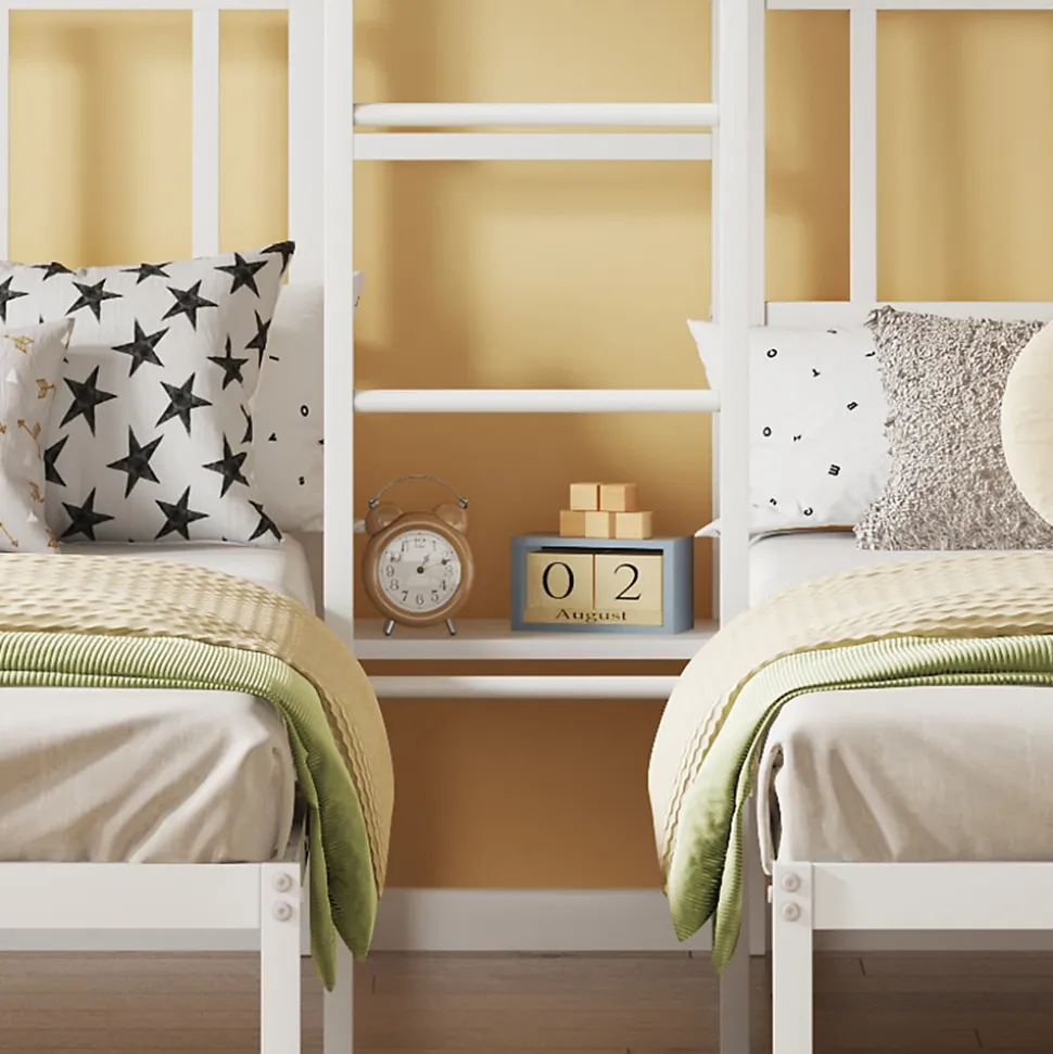 - Structure superposée en métal robuste avec échelle droite à 4 marches et garde-corps haut au lit supérieur pour la sécurité nocturne. Tablette tête de lit intégrée pour rangement pratique.