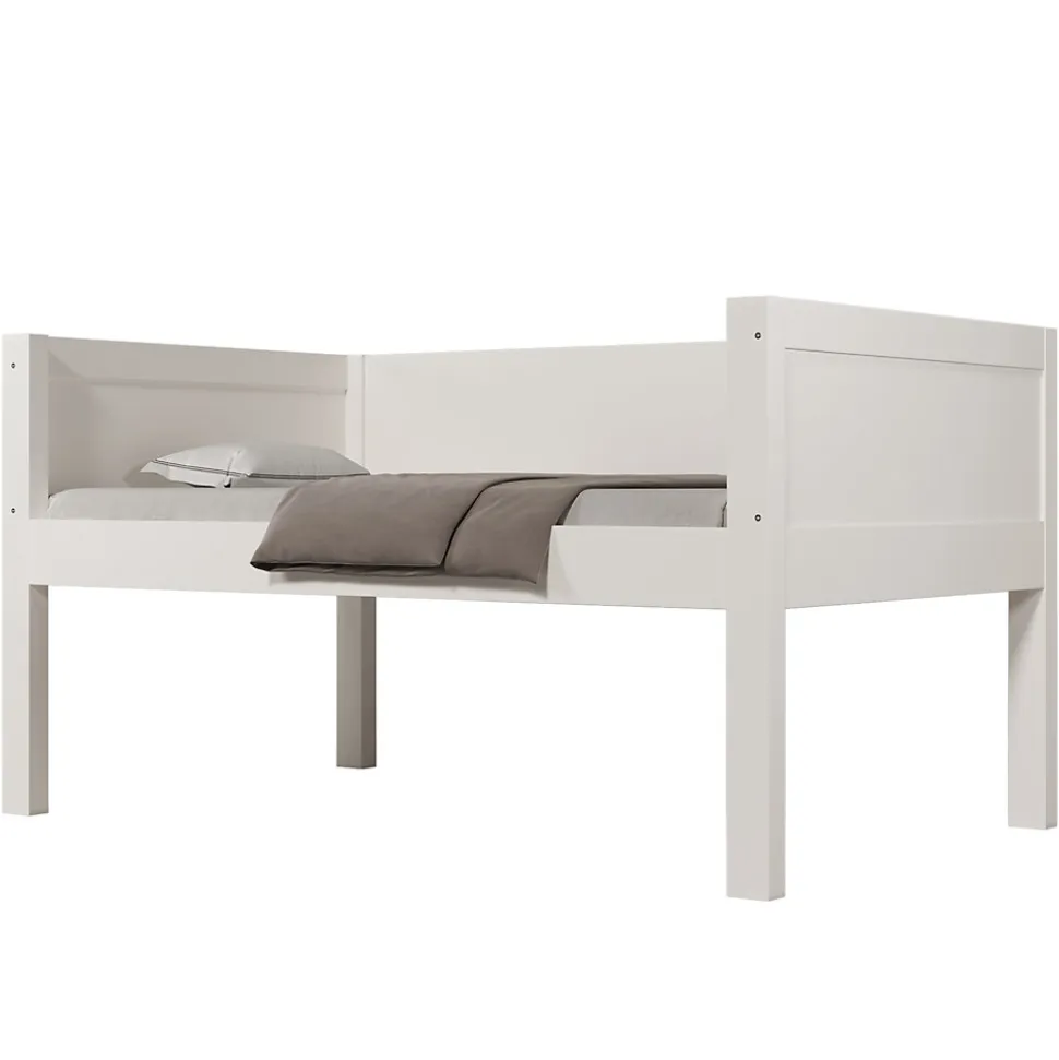 - Design en forme luge blanc, style campagne et silhouette douce pour chambre enfant ou ado. Structure en bois massif, MDF et métal; deux couchages 90×200 cm adaptés aux petits espaces.