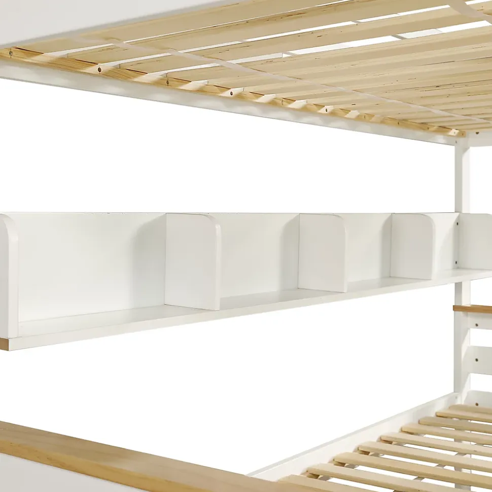 1. Design attrayant : Les lits superposés arborent une combinaison de blanc et de tons naturels, agrémentée de petites fenêtres décoratives sur les panneaux de la rambarde. Ce design original confère au lit une allure unique et en fait un élément particulièrement attrayant dans la chambre d’enfant. 2. Nombreux rangements : Ce lit se distingue par ses étagères ouvertes sur tout un côté. Celles-ci permettent de ranger télécommandes, lunettes et autres petits objets, ainsi que des collections personnelles comme des disques vinyles, des objets de collection d’anime ou des décorations, offrant ainsi un espace de rangement à la fois pratique et fonctionnel. 3. Sécurité optimale : La couchette supérieure est entièrement entourée de rambardes, assurant une sécurité accrue et empêchant les enfants de tomber pendant leur sommeil. 4. Solutions de rangement pratiques : La couchette inférieure est équipée de deux tiroirs spacieux, parfaits pour ranger le linge de lit, les vêtements ou les jouets. 5. Accès sécurisé par une échelle inclinée à quatre marches : L’accès à la couchette supérieure se fait par une échelle inclinée à quatre marches, à la fois sûre et pratique. Cette échelle est conçue pour une montée stable et facile, particulièrement adaptée aux enfants. 6. Pied de soutien central pour le lit inférieur : Le lit inférieur est doté d’un pied de soutien central qui lui confère une stabilité accrue. Ce pied garantit la sécurité et la stabilité du lit, même en cas d’utilisation intensive, renforçant ainsi sa structure et améliorant la sécurité. 7. Montage facile : Des instructions détaillées et toutes les pièces nécessaires sont fournies pour faciliter le montage. La simplicité d’installation vous permettra de profiter pleinement de votre nouveau lit. Remarque : Ce lit ne comprend pas de matelas.