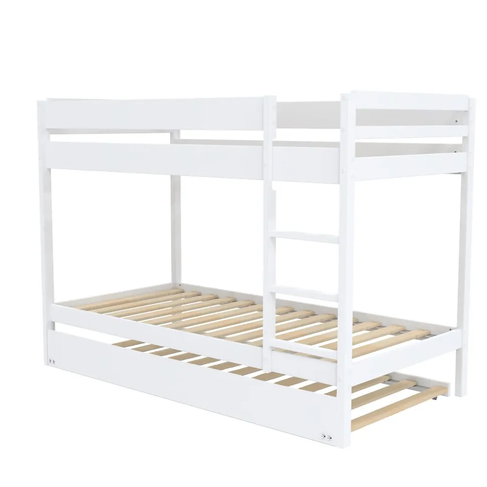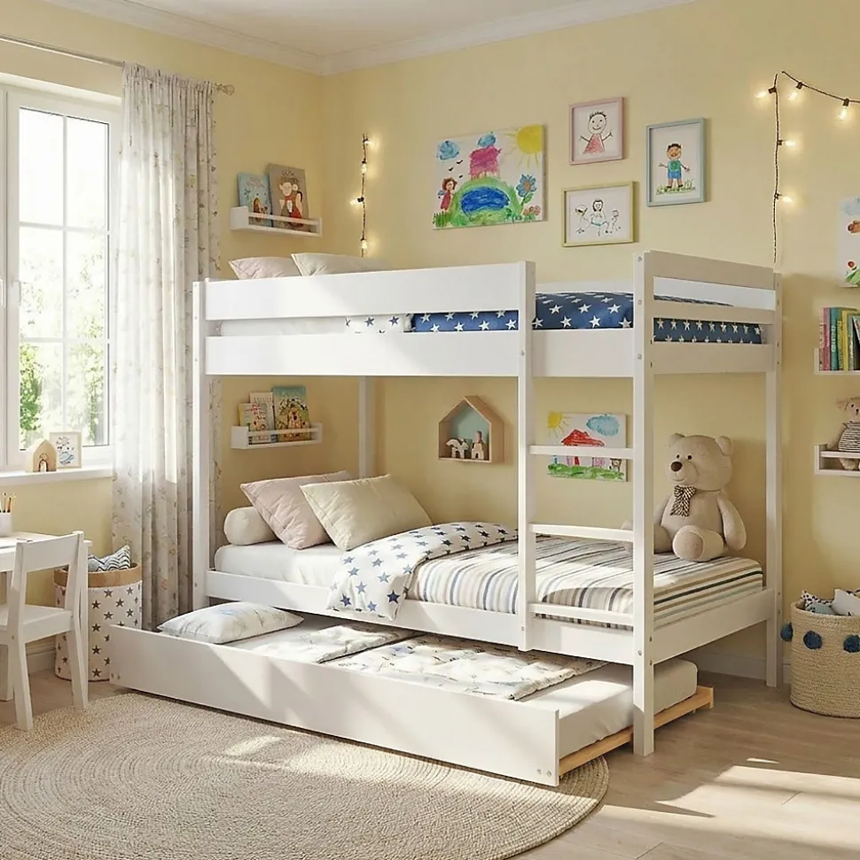 WALLY Lit superposé avec tiroir de lit – Structure en bois épicéa massif – Coloris blanc – Finition laqué – Echelle non réversible – Couchage 3 x 90 x 190 cm – Poids maximum supporté pour chaque couchage : 80 kg – Sommier inclus – Livré sans matelas – Dimensions : L196 x P100 x H139.6 cm