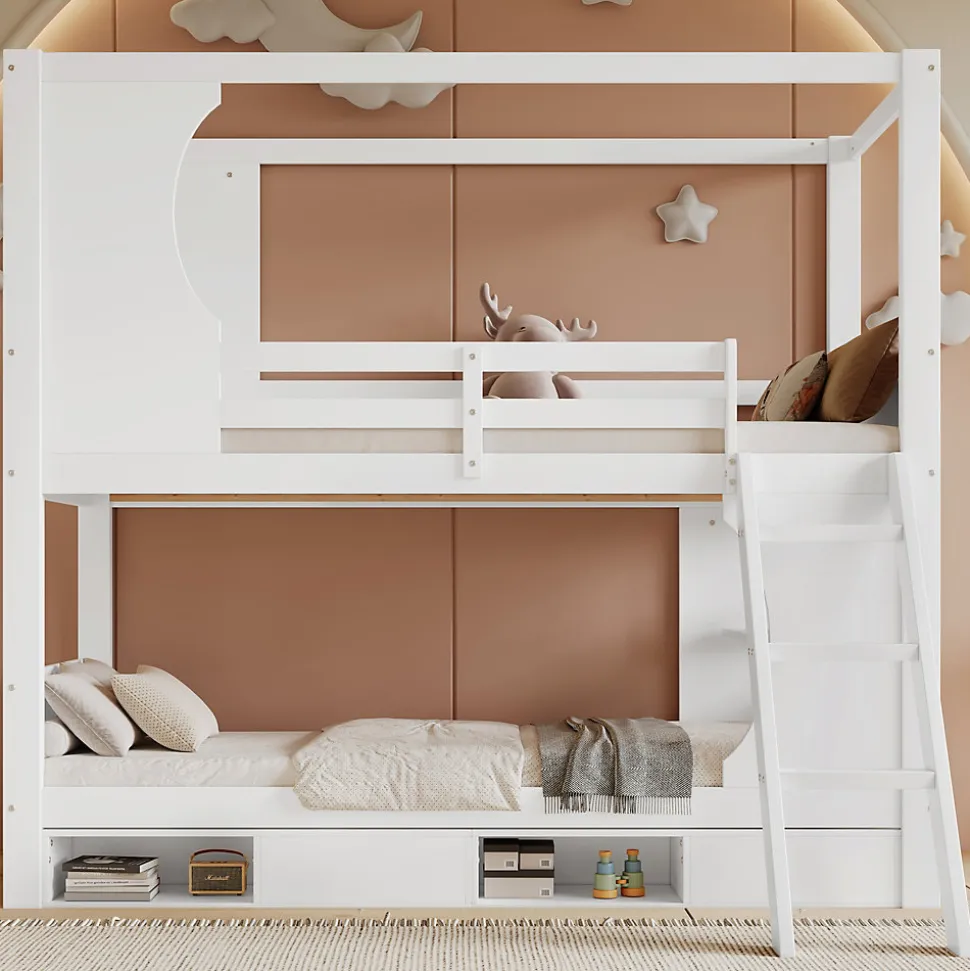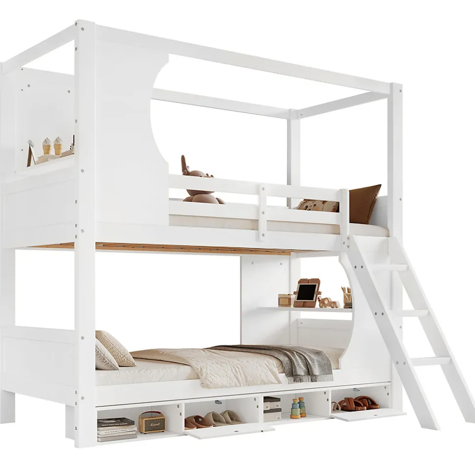 Lit superposé, avec garde-corps, bureau et rangement chaussures, MDF et pin, blanc, 90×200 cmCe lit superposé blanc allie sécurité, confort et fonctionnalité dans un design élégant et pratique. La plateforme supérieure est entourée de quatre solides garde-corps, garantissant une sécurité optimale tout en créant une atmosphère accueillante. Chaque lit est équipé d’un bureau intégré, offrant un espace idéal pour étudier, dessiner ou organiser des activités créatives, ce qui rend chaque couche polyvalente et fonctionnelle.L’espace sous le lit intègre un meuble à chaussures à quatre compartiments, dont deux avec portes, permettant de garder les objets personnels organisés et à portée de main, tout en optimisant l’utilisation de l’espace disponible. Fabriqué à partir de matériaux de haute qualité tels que le MDF, le pin et le contreplaqué, ce lit est à la fois robuste et durable, garantissant une base solide pour un sommeil réparateur et une utilisation longue durée.Certifié EN747, ce lit superposé répond aux normes de sécurité européennes les plus strictes, assurant une construction stable et fiable. Il offre trois zones fonctionnelles intégrées : un espace de couchage, un espace de rangement et un espace de travail, permettant de maximiser l’utilisation de la chambre tout en conservant un environnement ordonné et agréable.Le montage est simple grâce aux instructions détaillées et aux pièces fournies, rendant l’installation rapide et plaisante. Avec ses dimensions de 90×200 cm et une épaisseur de matelas recommandée de 12 cm, ce lit superposé combine style, sécurité et praticité, offrant un environnement chaleureux et créatif pour la chambre des enfants. C’est un choix idéal pour créer un espace ludique et organisé tout en apportant confort et robustesse au quotidien.