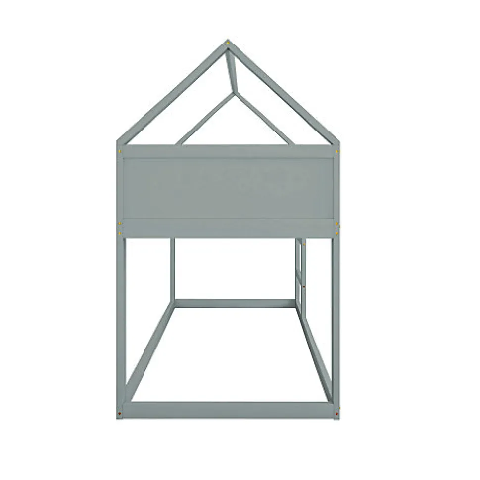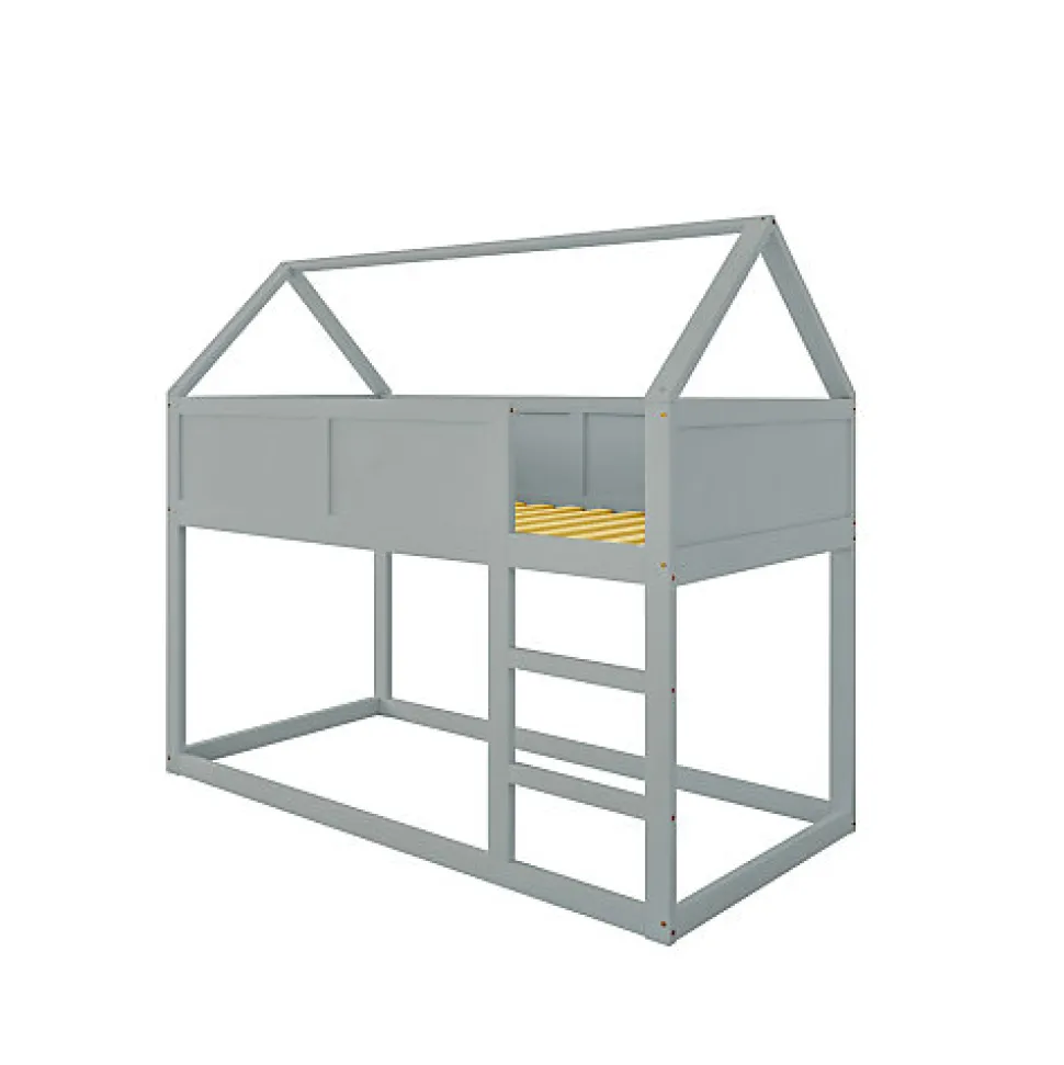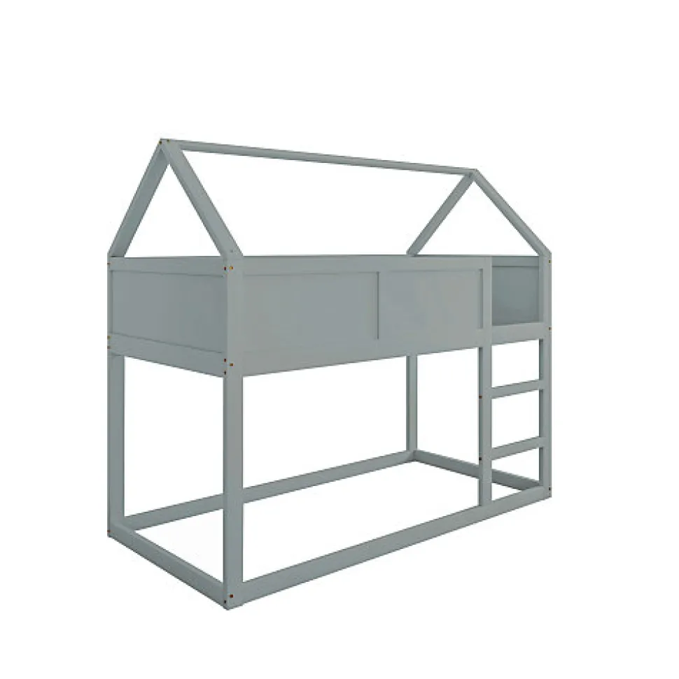 Lit superposé bas 90×200 cm en bois massif gris, idéal pour deux enfants, avec design multifonction et esthétique moderne