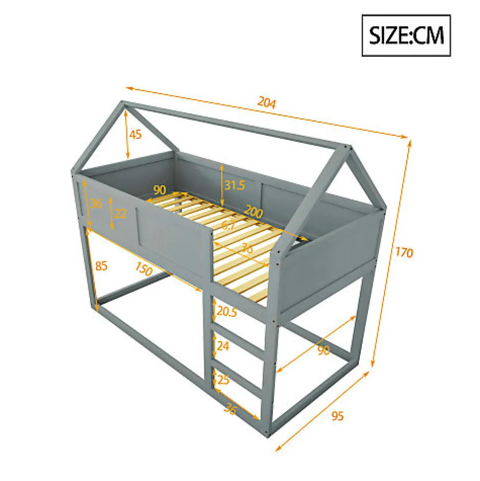 Description du produitCe lit superposé bas 90×200 cm en bois massif avec finition grise est conçu pour optimiser l’espace dans une chambre d’enfant tout en offrant deux couchages confortables. Sa structure solide et sa hauteur réduite le rendent particulièrement adapté aux plus jeunes.Caractéristiques principales Gain de place : Idéal pour les familles avec deux enfants ou les chambres de taille réduite, tout en conservant un confort optimal. Design multifonction : Le couchage inférieur peut également servir d’espace de jeu ou de détente selon les besoins. Structure robuste : Fabriqué en bois massif pour garantir sécurité, stabilité et durabilité au quotidien. Esthétique moderne : La finition grise s’intègre harmonieusement dans toutes les décorations intérieures contemporaines. Dimensions pratiques : Adapté aux matelas 90×200 cm (non inclus). Charge maximale : 120 kg. Hauteur de matelas recommandée : 12 cm max.Informations complémentairesDimensions assemblées : 204 x 95 x 170 cm (L x l x H)Livré en 2 colis avec une notice de montage détaillée.